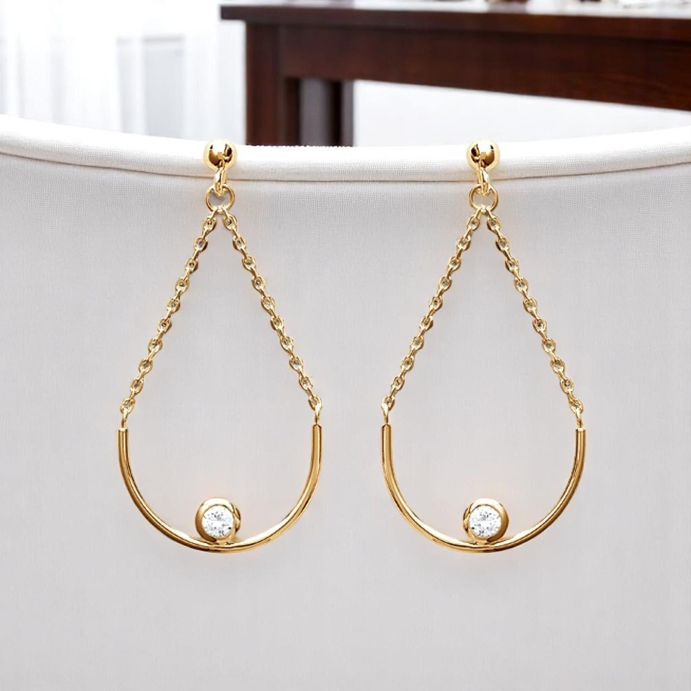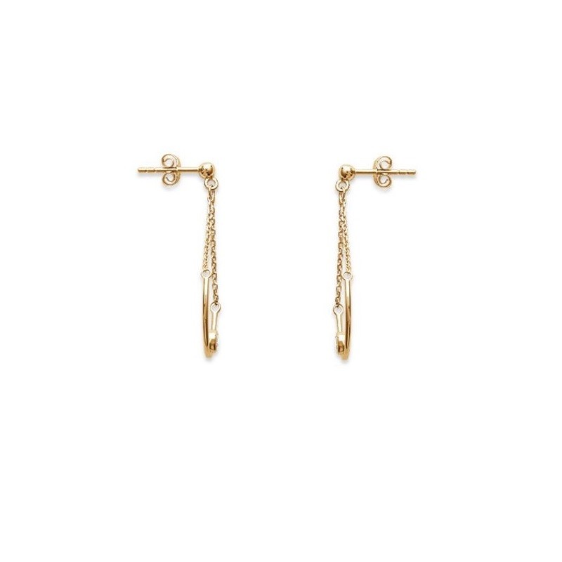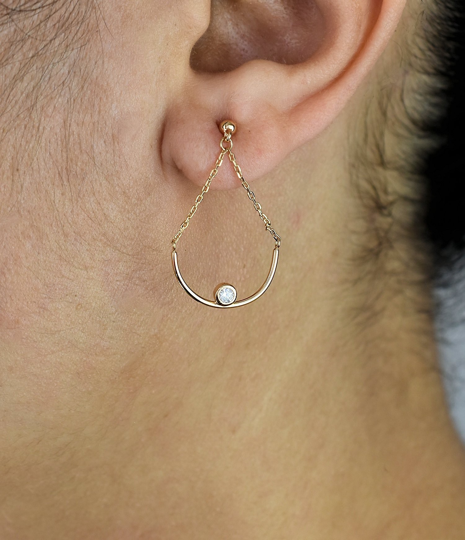 Parce qu’elles capturent cette élégance contemporaine qui refuse de choisir entre structure et légèreté. Le demi-cercle apporte une touche architecturale affirmée, tandis que les chaînettes créent ce mouvement gracieux qui adoucit la géométrie. Les zirconium ponctuent cette cascade de lumière scintillante qui attire naturellement le regard. Portées, elles deviennent ce statement sophistiqué qui fonctionne aussi bien au quotidien qu’en soirée. C’est l’alliance parfaite entre modernité graphique et féminité en mouvement, force des lignes et douceur du balancement.