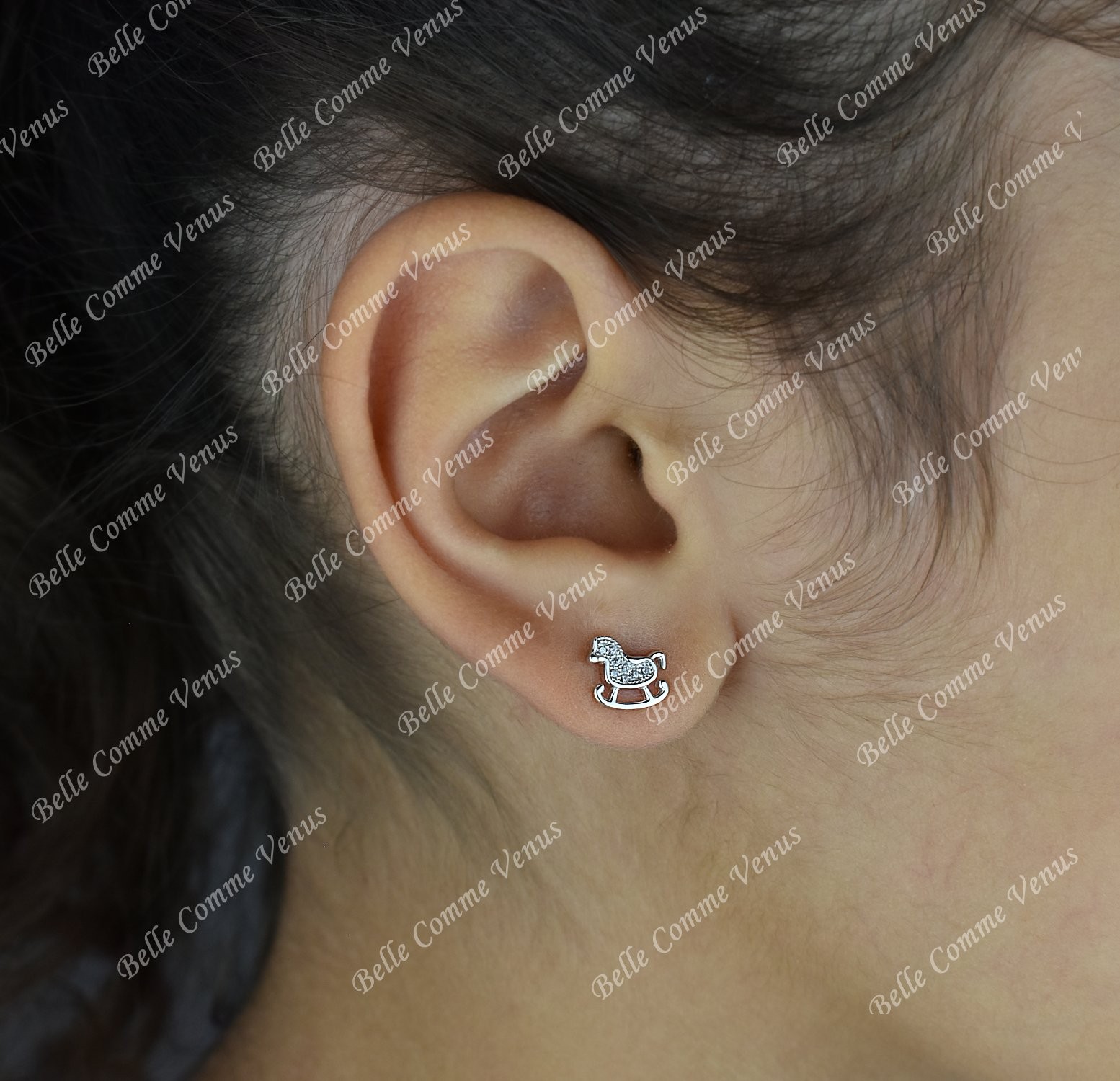 Les boucles d'oreilles ont une hauteur de 0.7 cm et une largeur de 0.9 cm, parfaites pour les petites oreilles des enfants. Leur design en forme de cheval à bascule apporte une touche ludique et mignonne.
