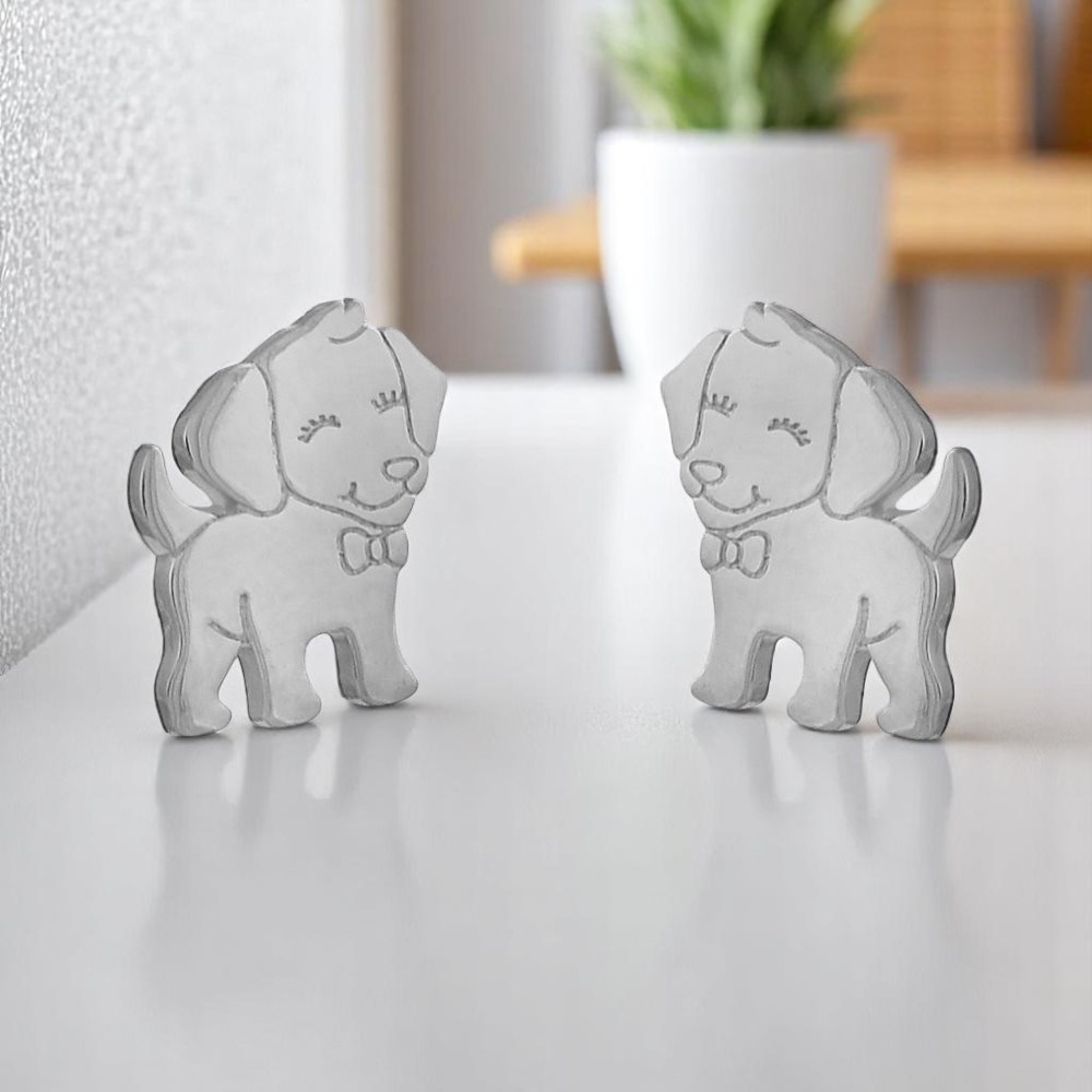 De petits chiens souriants en argent 925 rhodié, spécialement conçus pour les oreilles d’enfant. Ces boucles miniatures capturent toute la joie et la tendresse de son animal préféré dans un format adapté.