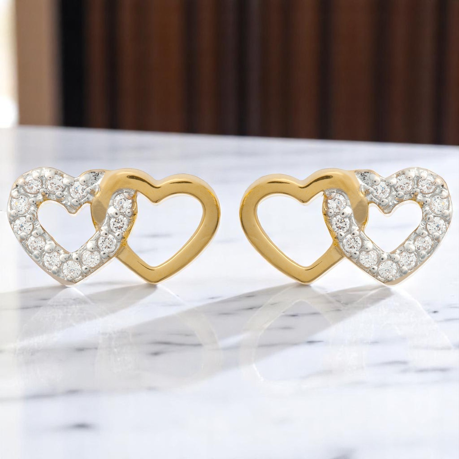 Ces boucles d’oreilles cœurs enlacés plaqué or célèbrent l’union des sentiments avec sophistication. Deux cœurs entrelacés en plaqué or 2 tons sertis d’oxydes de zirconium créent un effet bicolore moderne et romantique. Le plaqué or 750/1000 3 microns garantit un éclat doré chaleureux et une résistance exceptionnelle au quotidien.