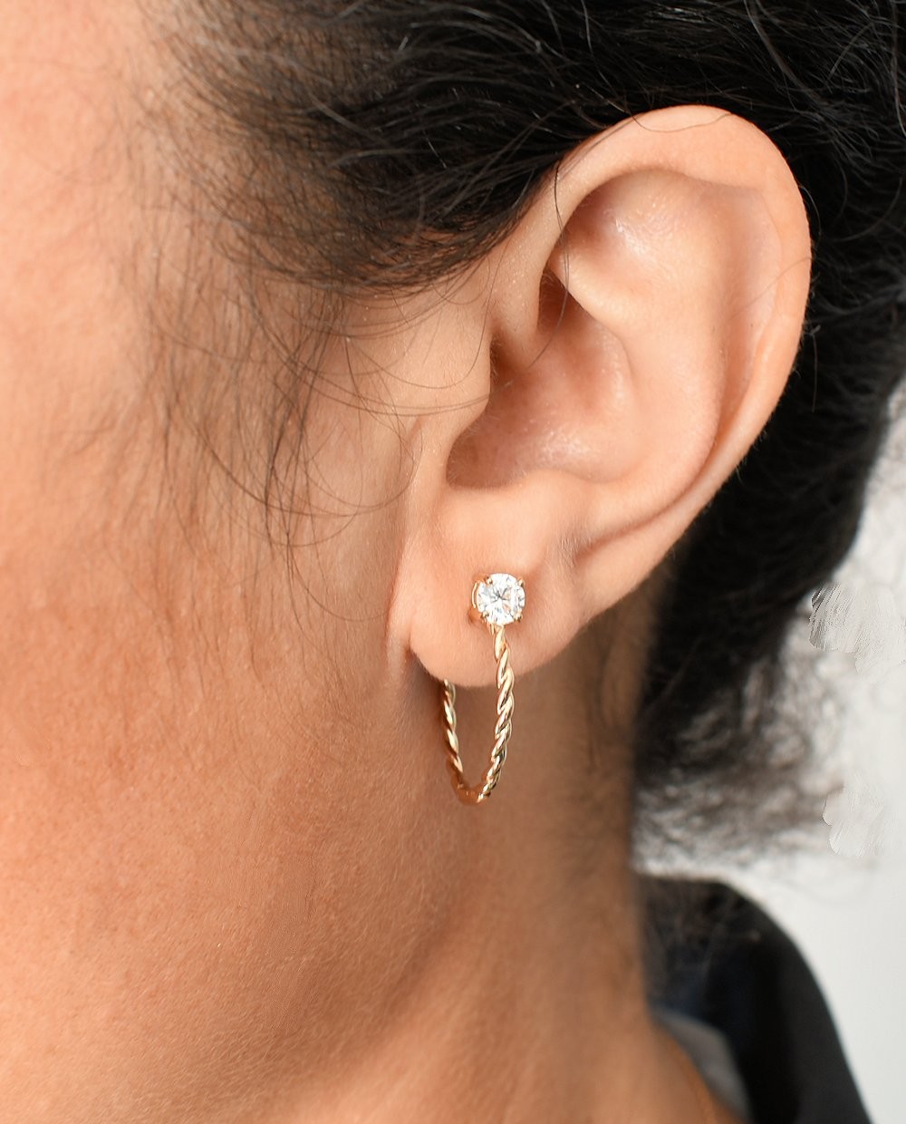 Les créoles effet torsadé tressé sont des pièces uniques qui captent la lumière de manière spectaculaire, grâce à leur design sophistiqué et à l'éclat de l'oxyde de zirconium serti 4 griffes.