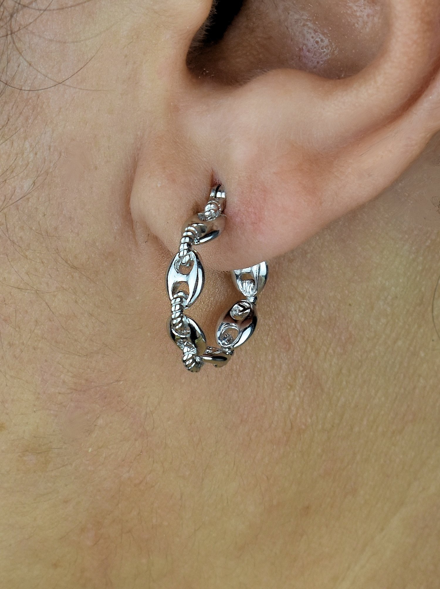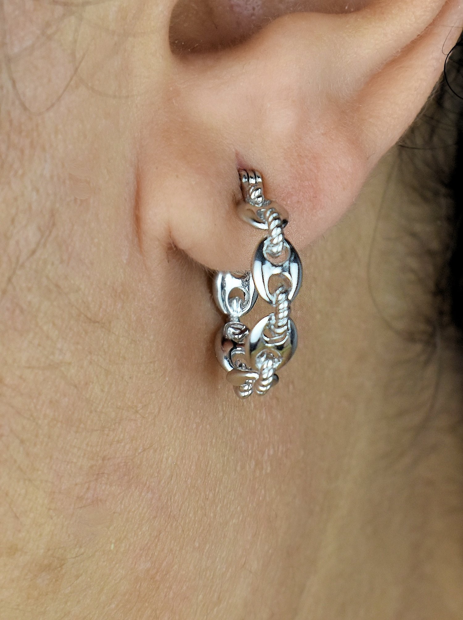 Les créoles présentent un diamètre de 1.6 cm, ce qui les rend parfaites pour être remarquées sans être trop imposantes. La suite de maillons grains de café reliés par un anneau effet tressé crée un effet visuel intéressant et apporte une touche d'originalité à ces boucles d'oreilles.