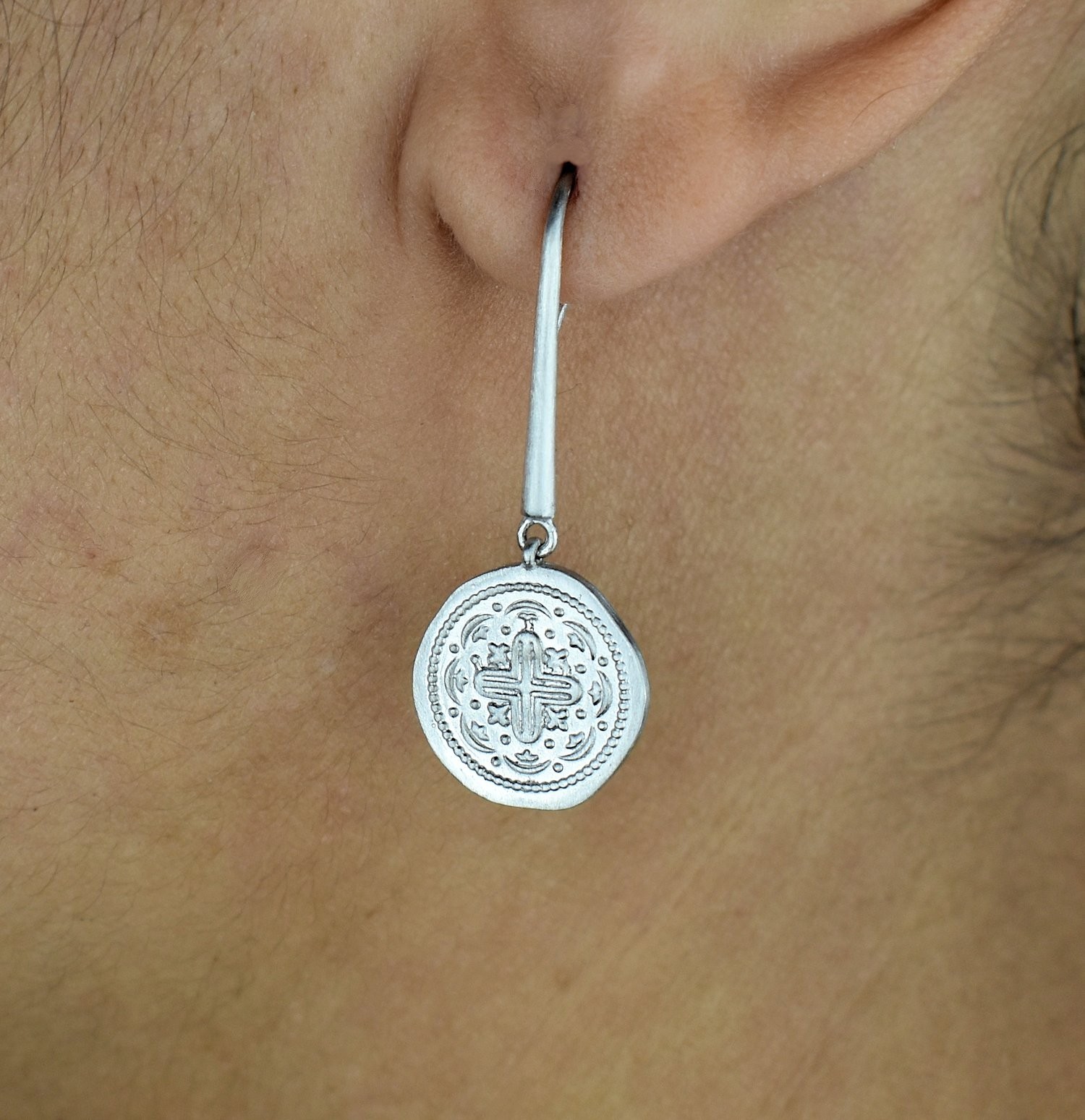 Boucles d’oreilles croix médaille antique argent 925 : spiritualité vintage élégante