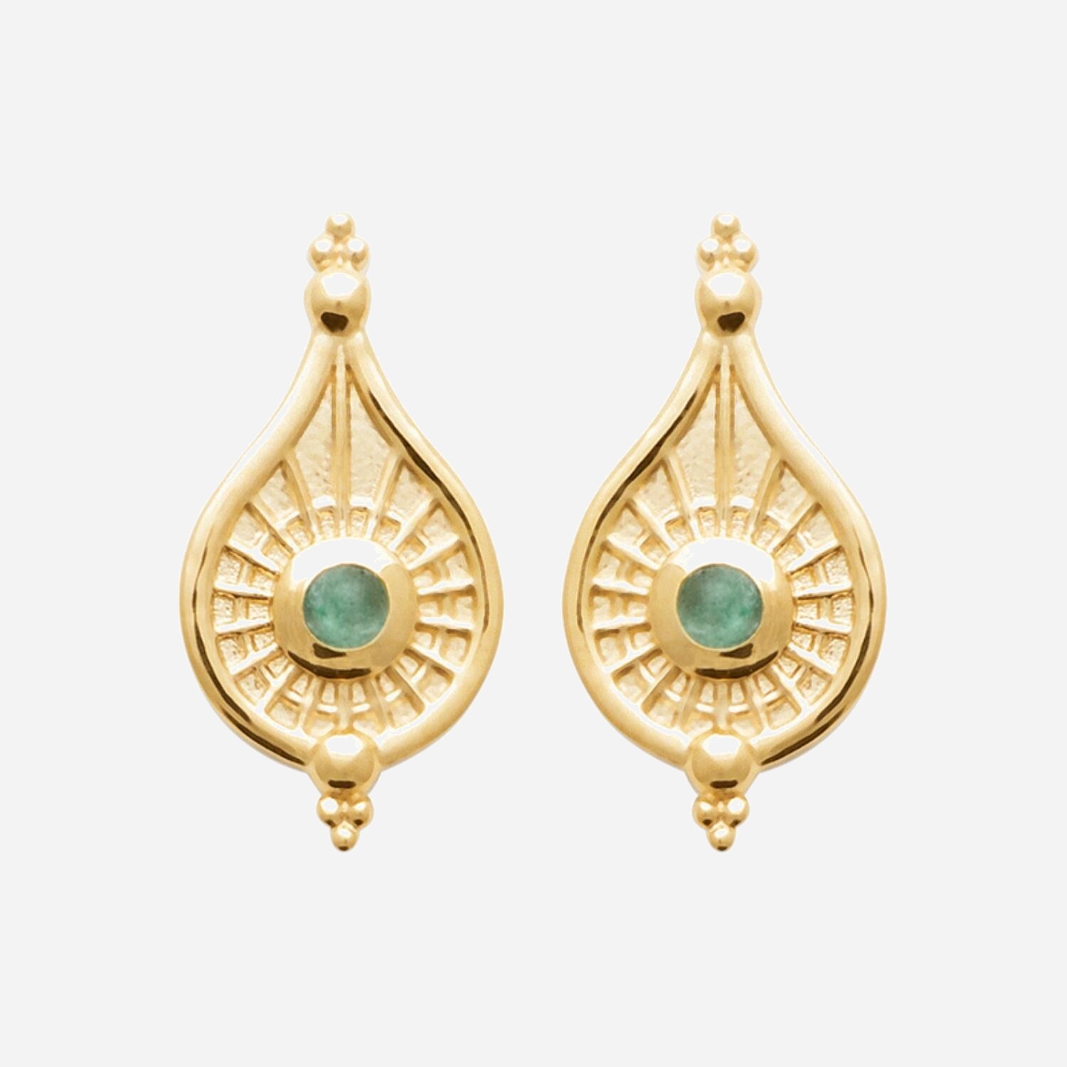Une goutte d’eau au style orientale ornée d’aventurine pierre naturelle en plaqué or 750 – 3 microns. Cette fusion entre la forme intemporelle de la goutte et l’inspiration orientale crée un bijou raffiné où pierre verte apaisante et métal précieux se rencontrent.