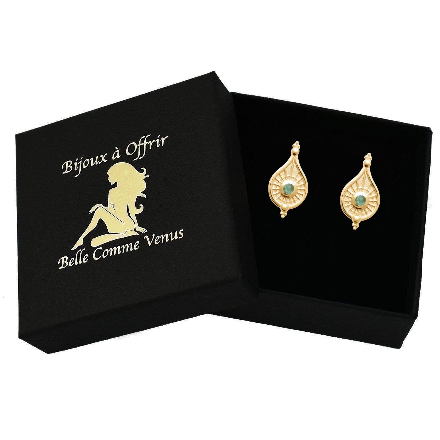 Parce qu’elles marient l’élégance de la goutte intemporelle avec la sophistication du style orientale. La pierre naturelle aventurine apporte ce vert doux tacheté d’inclusions brillantes qui évoque la nature apaisante, reconnue pour ses vertus calmantes et harmonisantes. Le design orientale ajoute cette dimension exotique raffinée qui distingue ces boucles des créations classiques. Le plaqué or sublime cette composition d’une chaleur dorée qui crée un contraste fascinant entre vert minéral et or précieux. C’est le bijou qui fusionne Orient et Occident, lithothérapie et sophistication, nature minérale et élégance orientale dorée aux oreilles.