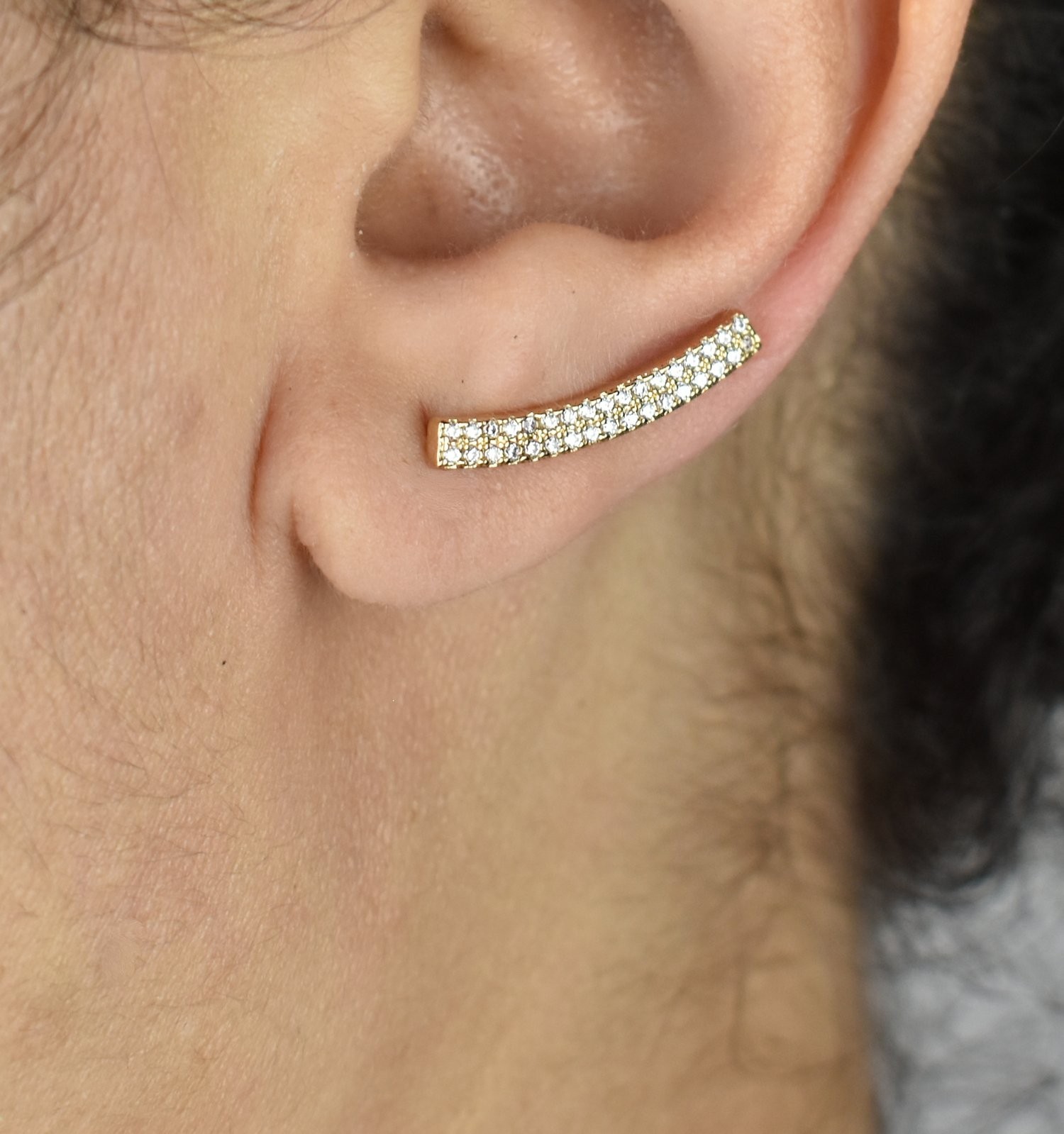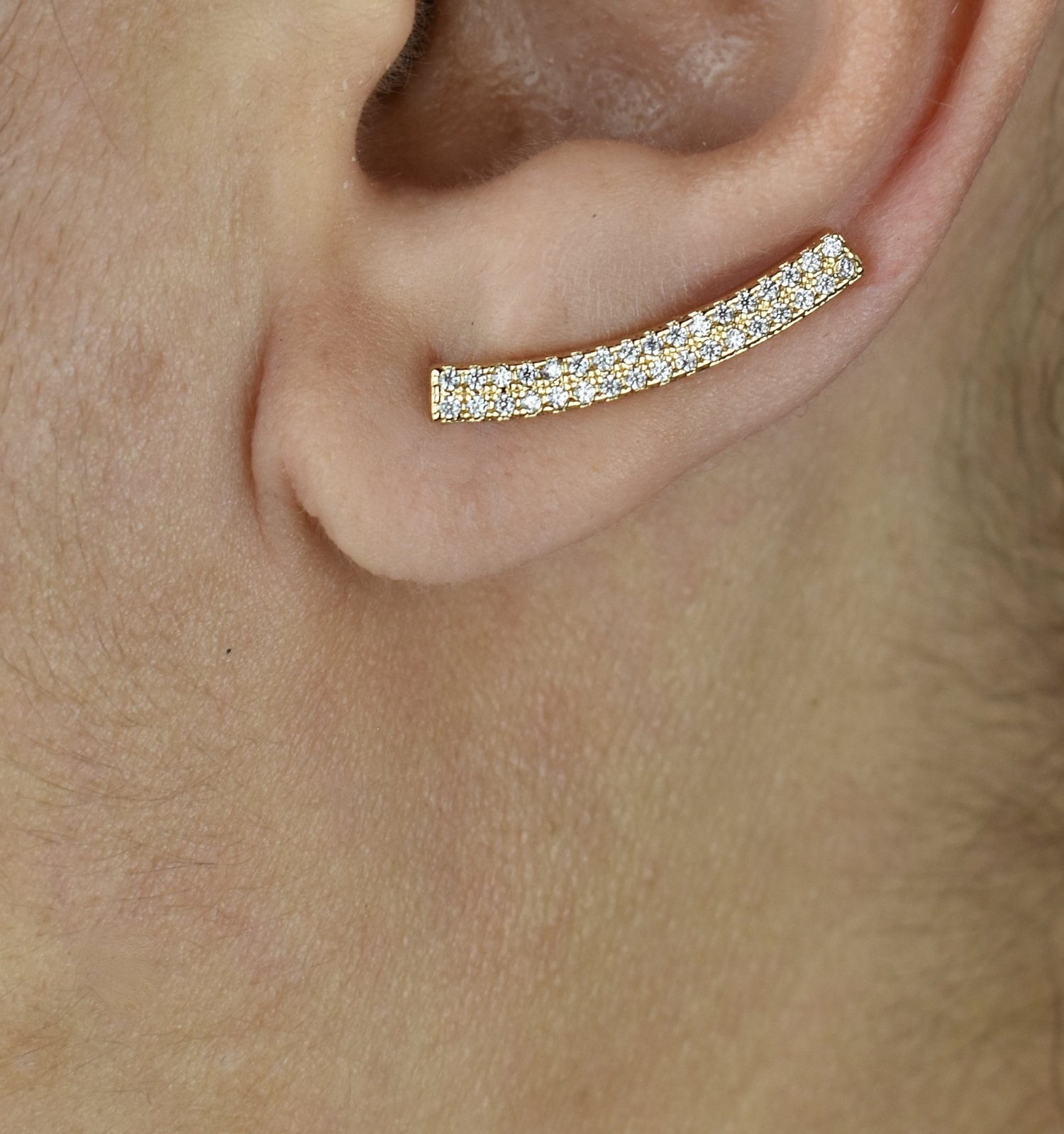 Des boucles d’oreilles grimpantes barre zirconium plaqué or au design architectural