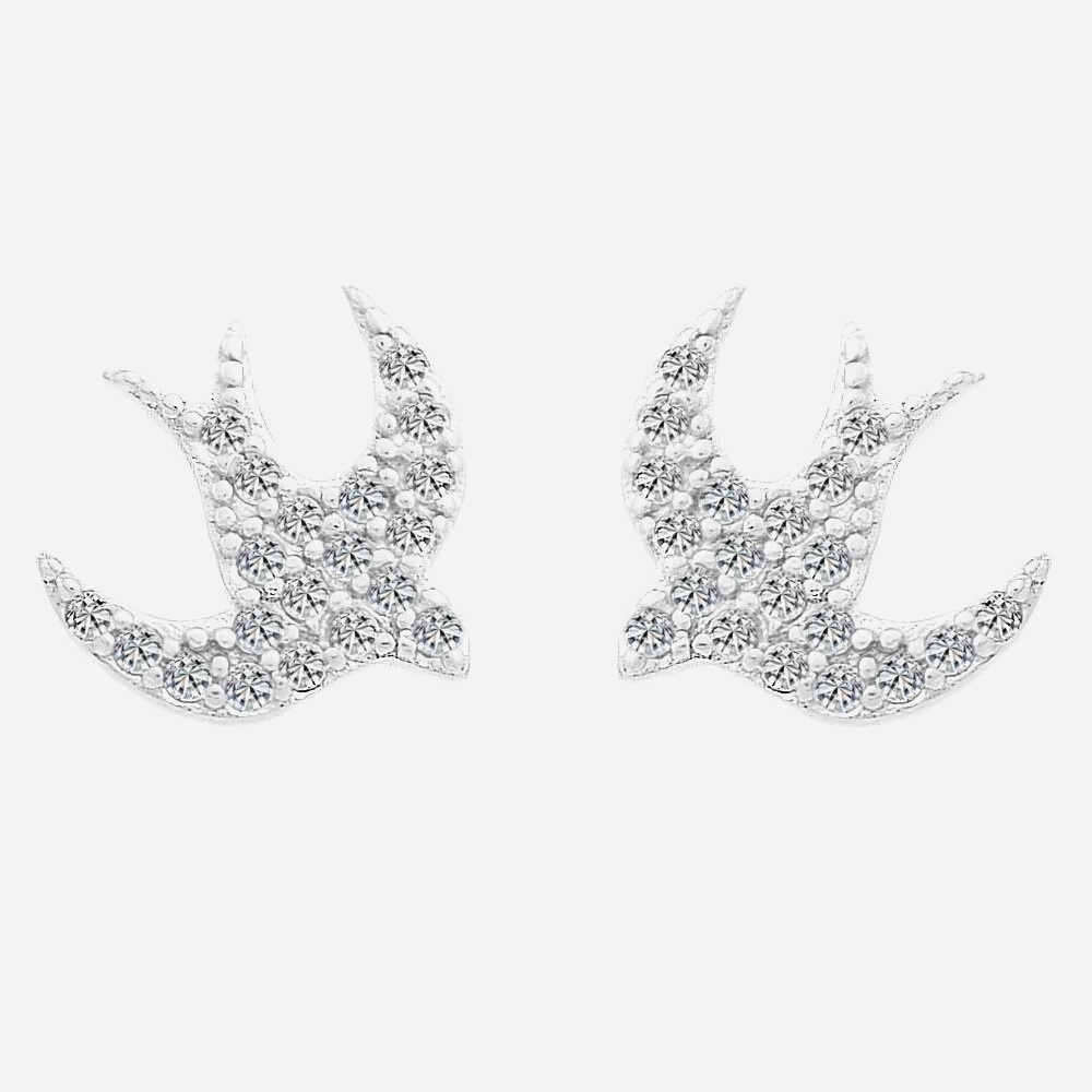De délicates hirondelles entièrement serties d’oxydes de zirconium scintillants en argent 925 rhodié. Ces oiseaux symboliques capturent toute la grâce du messager du printemps qui annonce les beaux jours, transformés en bijoux lumineux aux oreilles.