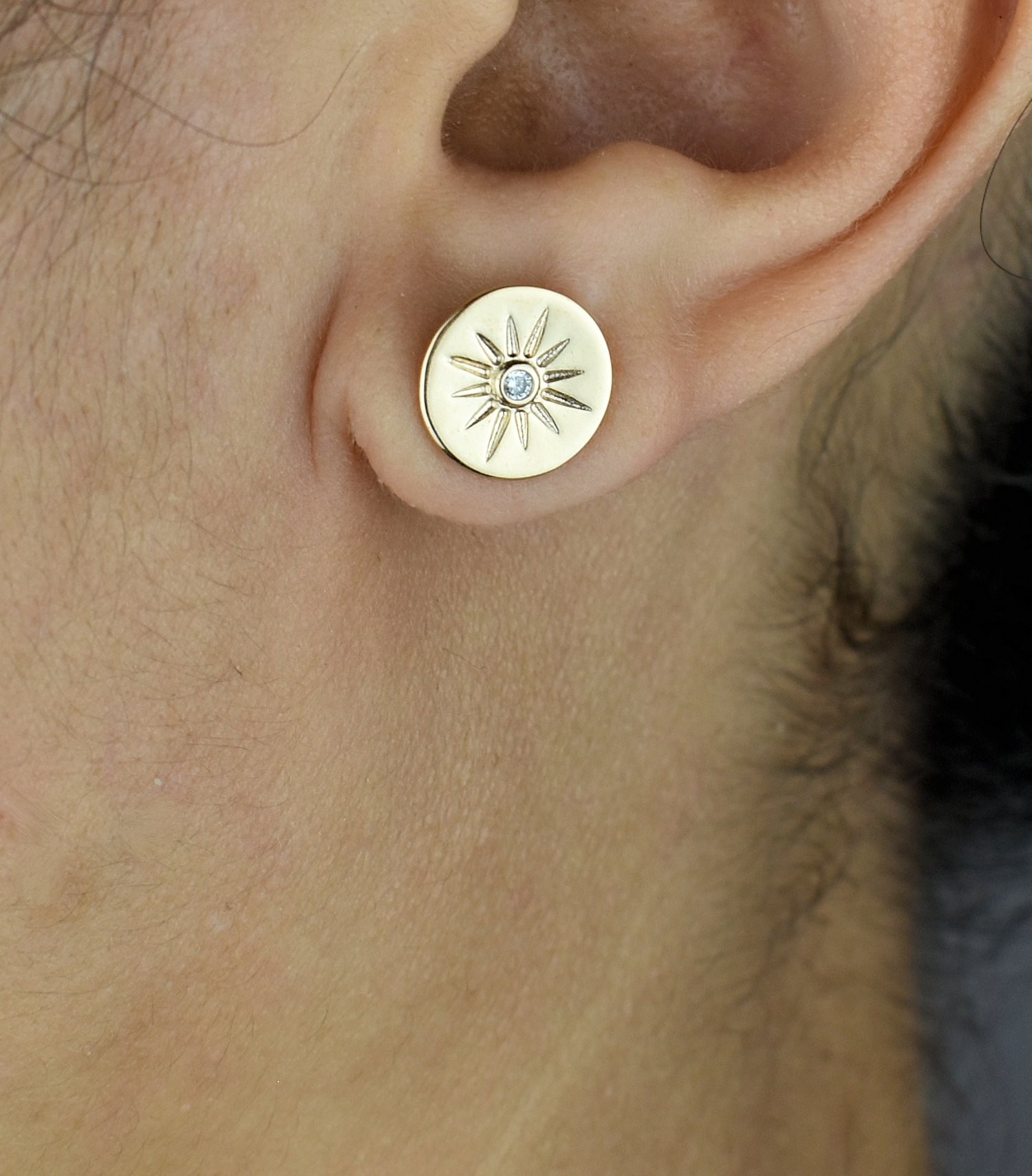 Boucles d’oreilles médaille soleil oxyde zirconium plaqué or : lumière rayonnante scintillante