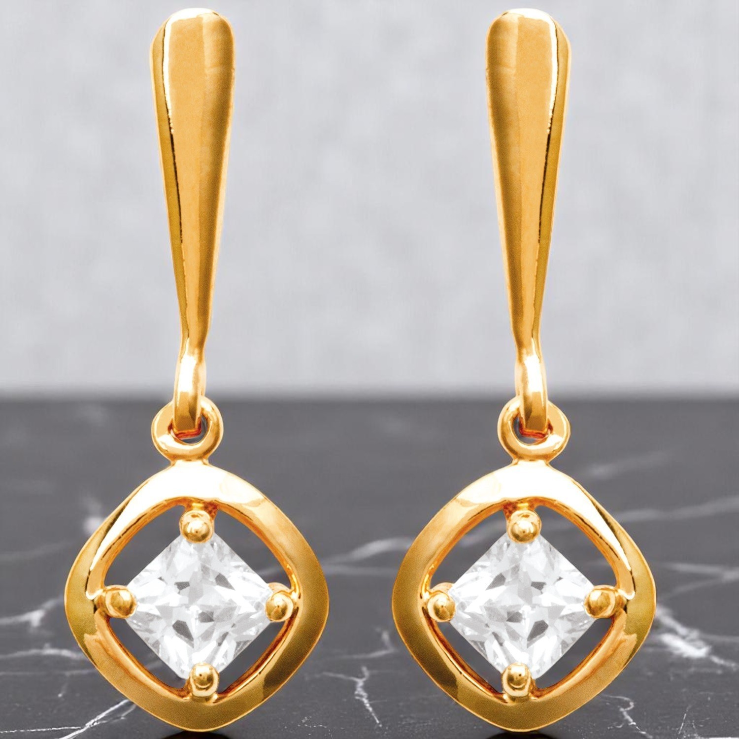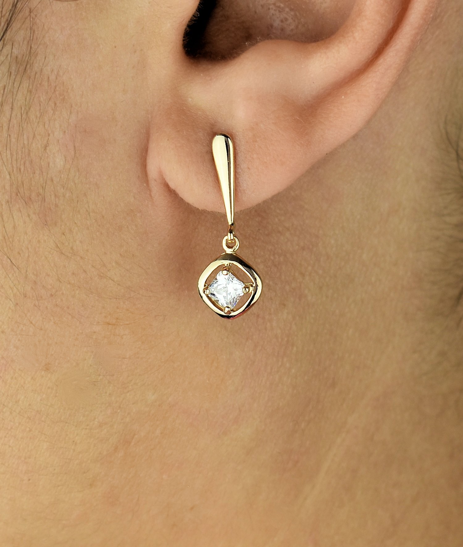 Des boucles d’oreilles pendantes losange zirconium plaqué or d’une modernité affirmée