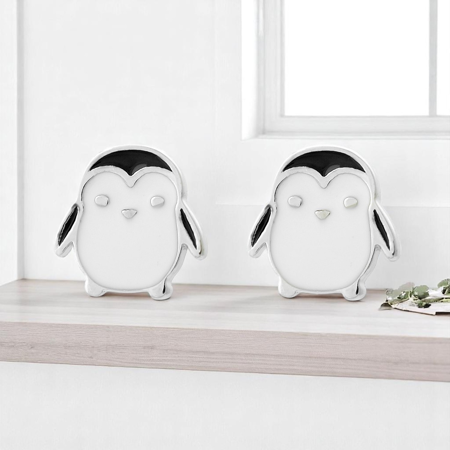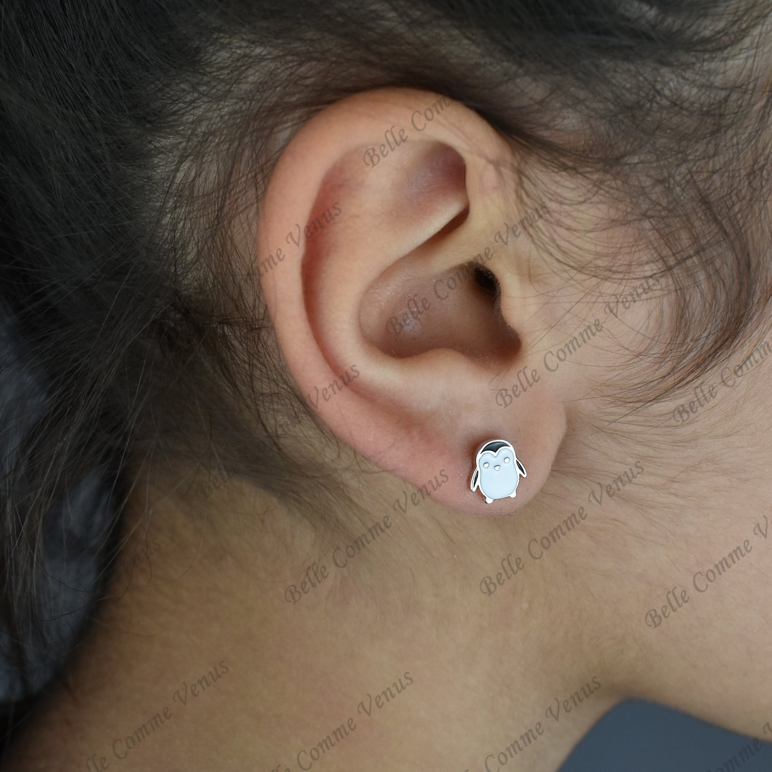 De petits pingouins ornés d’émail coloré blanc et noir en argent 925 rhodié, spécialement conçus pour les oreilles d’enfant. Ces boucles miniatures capturent toute l’adorabilité de cet animal attachant avec son ventre blanc et son dos noir caractéristiques.