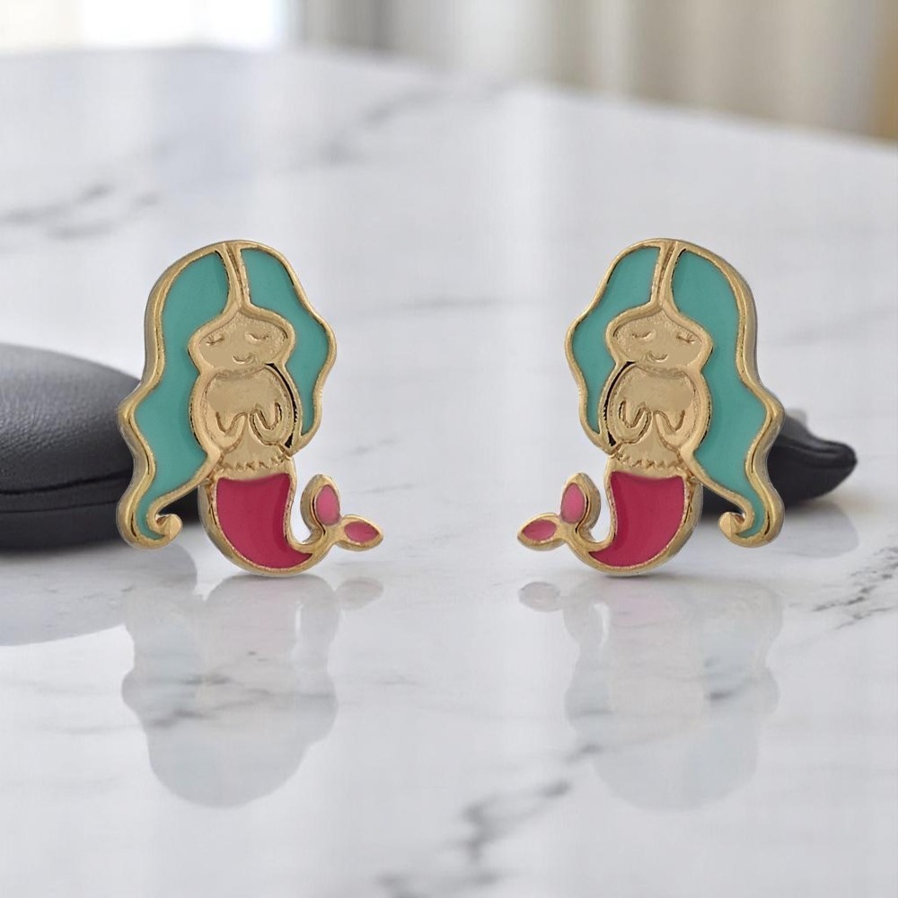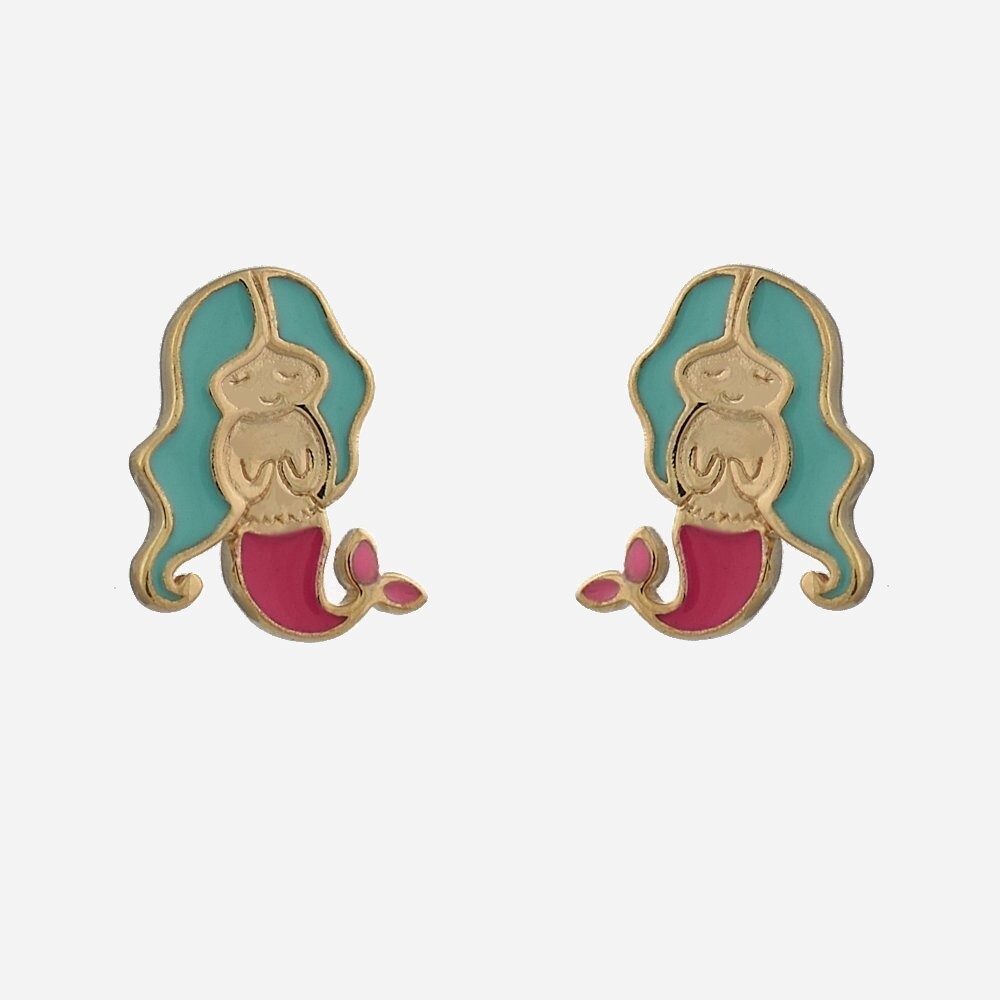 De petites sirènes ornées d’émail coloré en plaqué or 750 – 3 microns, spécialement conçues pour les oreilles d’enfant. Ces boucles miniatures capturent toute la magie de cette créature légendaire des océans avec ses couleurs éclatantes et sa queue scintillante.