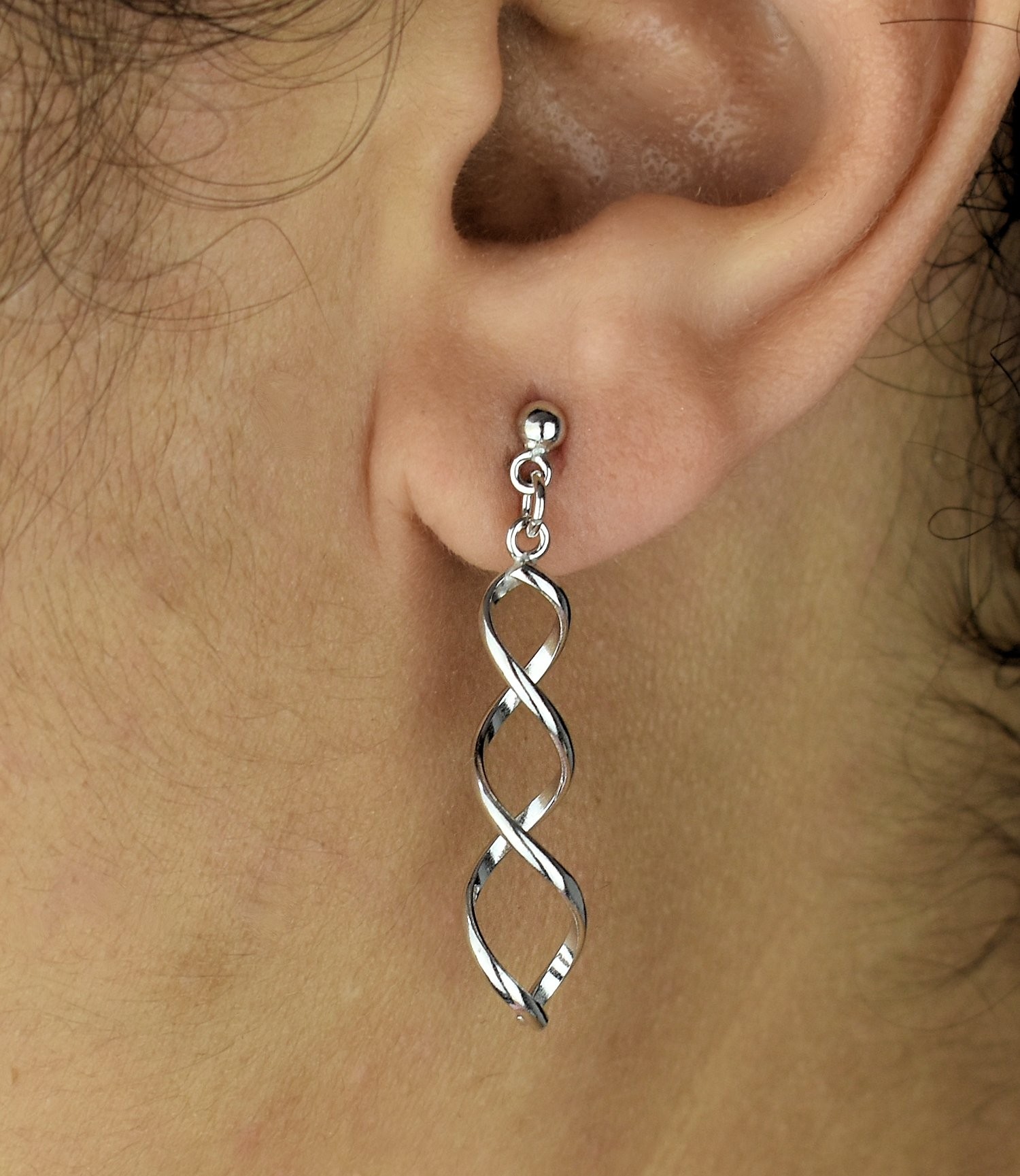 Une spirale torsadée sculptée en argent 925 rhodié qui capte la lumière dans un jeu d’ombres et de reflets fascinant. Cette forme géométrique organique crée un mouvement visuel perpétuel, comme si le métal dansait à vos oreilles.