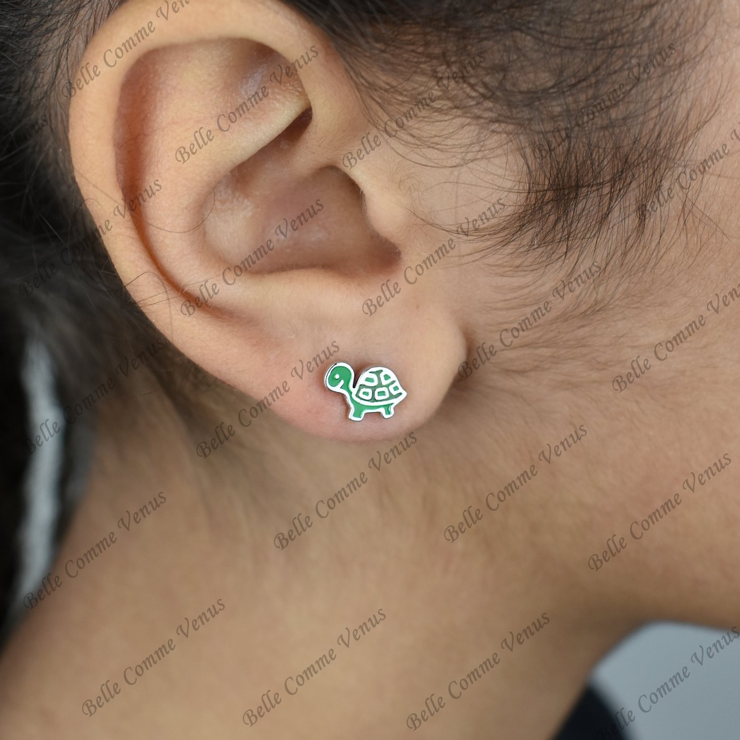 Les boucles d'oreilles enfant tortue émail coloré vert Argent 925 Rhodié ajoutent une touche de style et de nature aux oreilles de votre enfant.