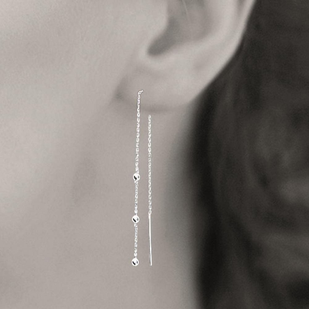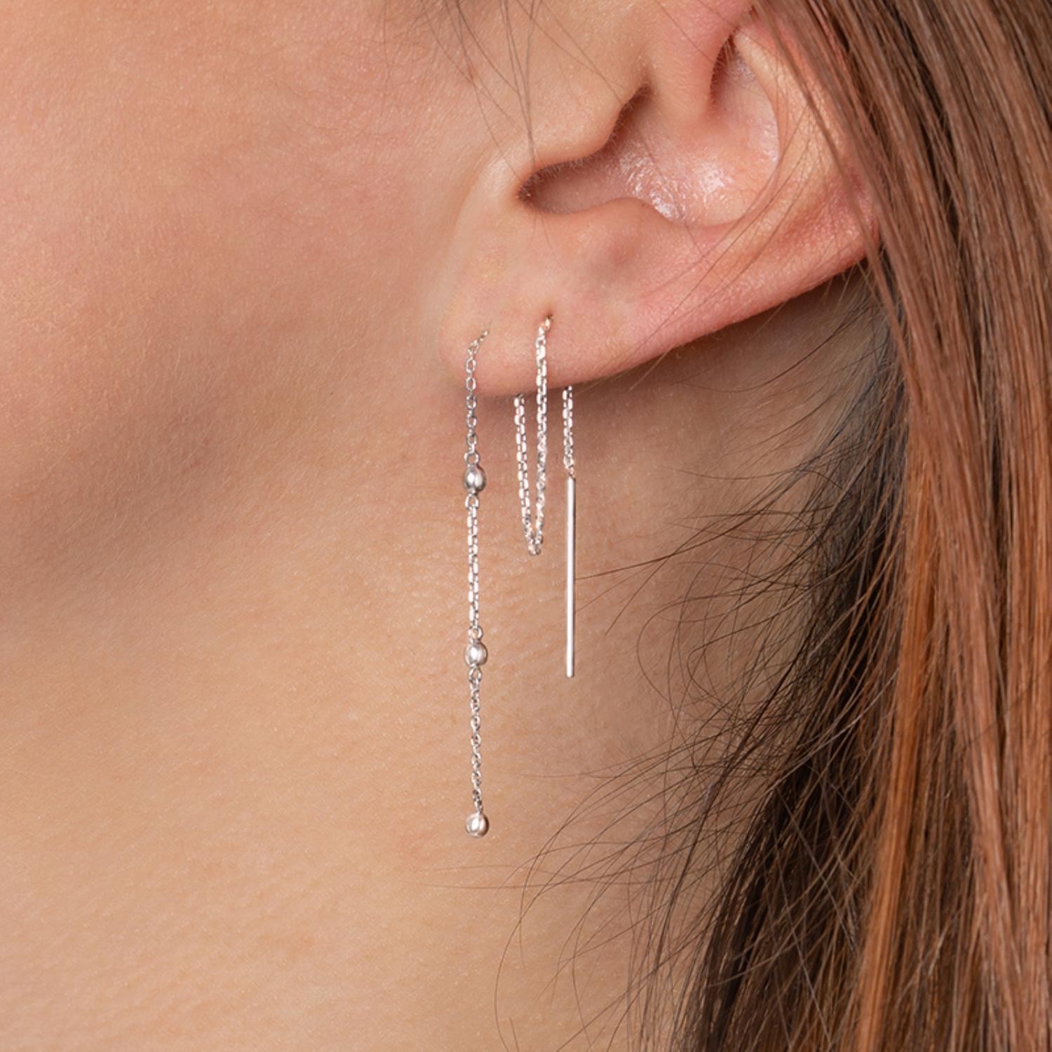 Le système traversant crée une ligne élégante qui traverse l’oreille, prolongée par de fines chaînes ornées de perles de billes délicates. Le rhodiage protège l’argent et garantit un éclat durable à ce bijou moderne qui joue avec la légèreté et l’élégance.