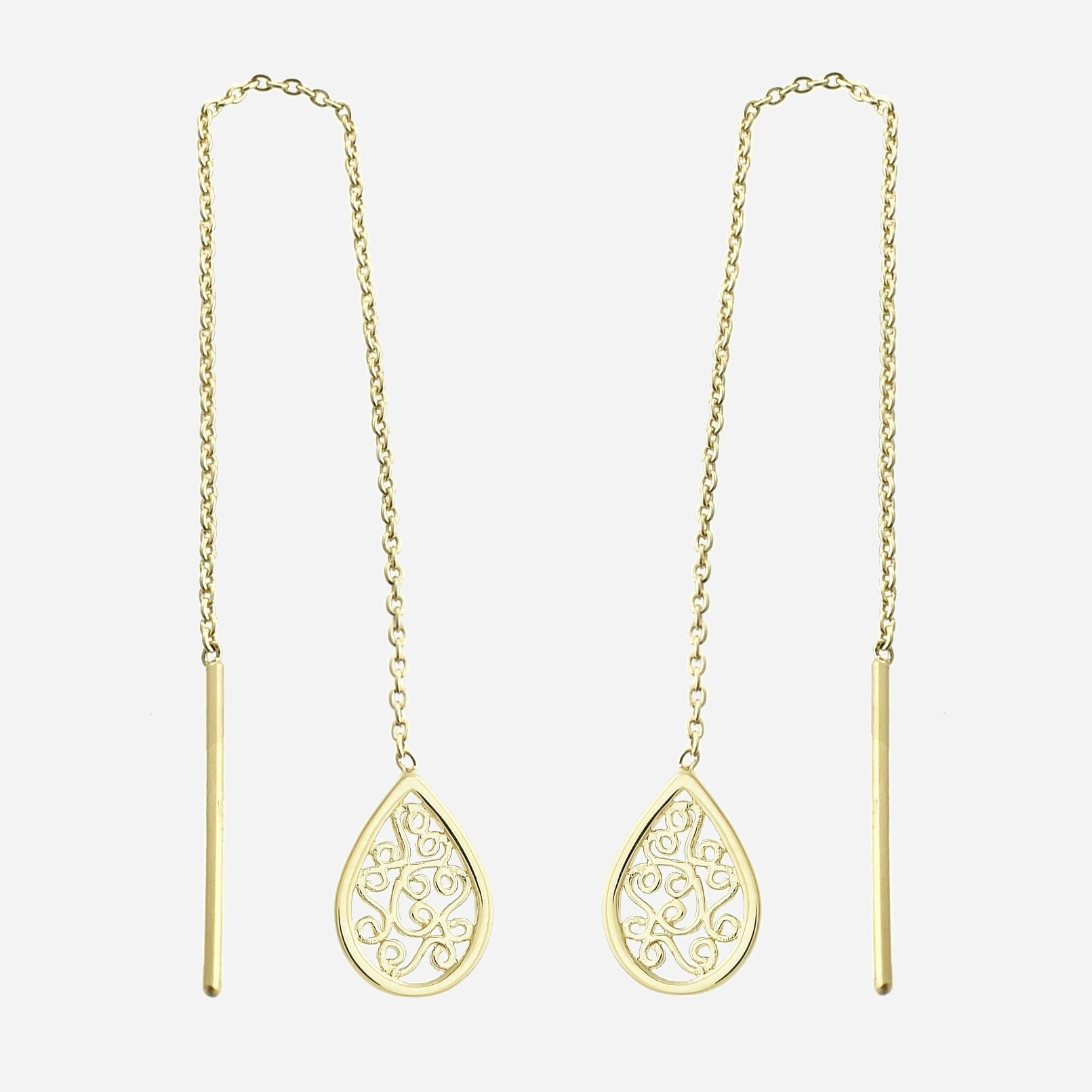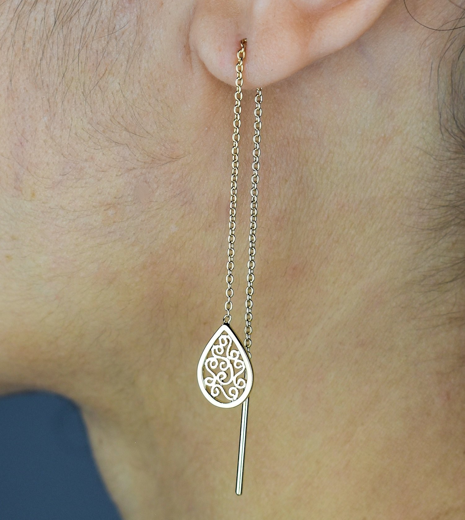 Des boucles traversantes d’où pend une goutte ornée d’arabesques reliée par une chaînette délicate en plaqué or 750 – 3 microns. Cette architecture complexe crée un mouvement fluide et sophistiqué qui traverse votre lobe pour créer une ligne élégante continue.