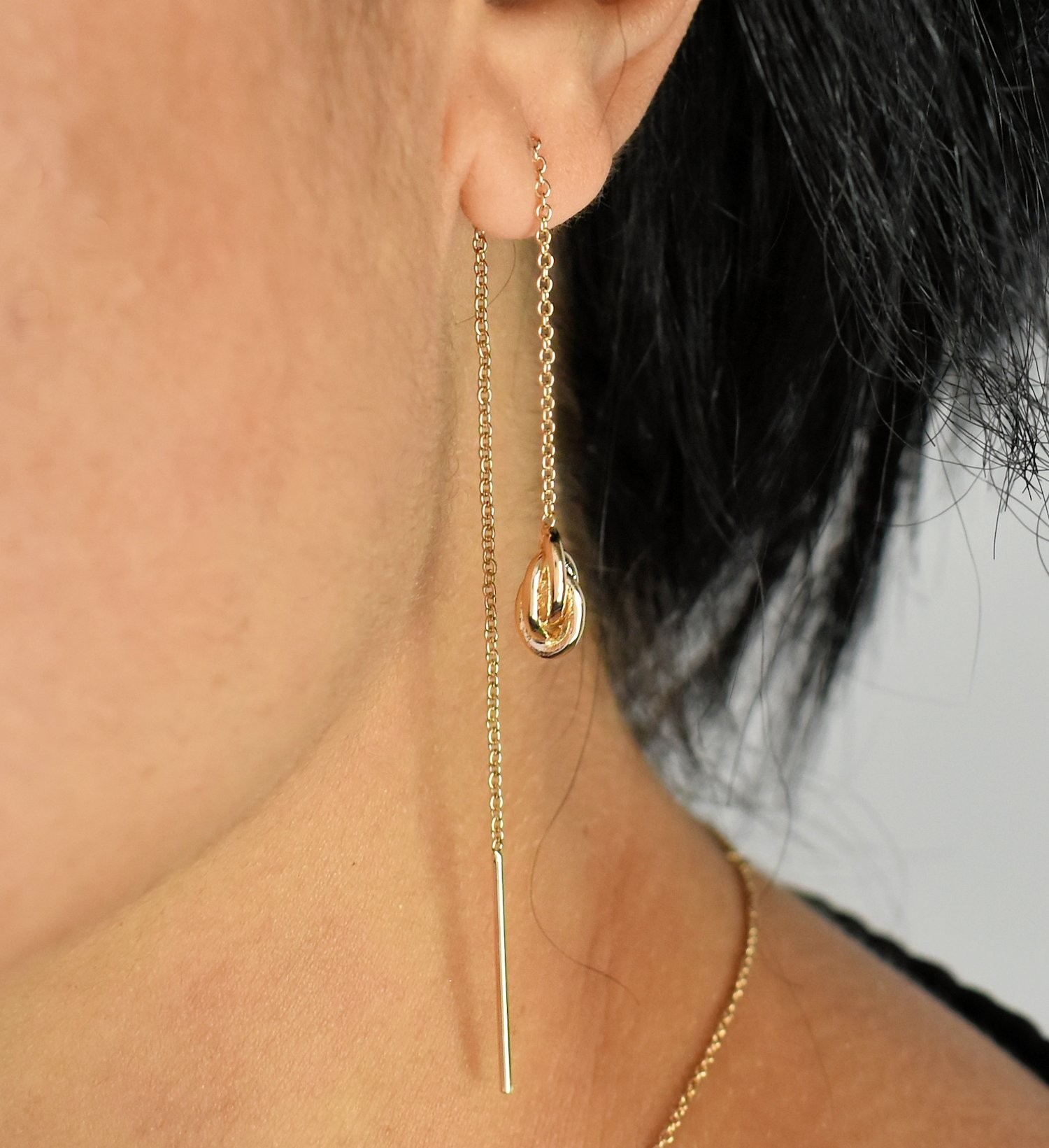 Les boucles d’oreilles traversantes noeud chaînette plaqué or 750 incarnent l’élégance féminine et le mouvement gracieux. Le nœud tombant avec chaînette crée fluidité et délicatesse, sublimant votre visage avec raffinement doré contemporain et sophistication intemporelle dynamique élégante mobile.