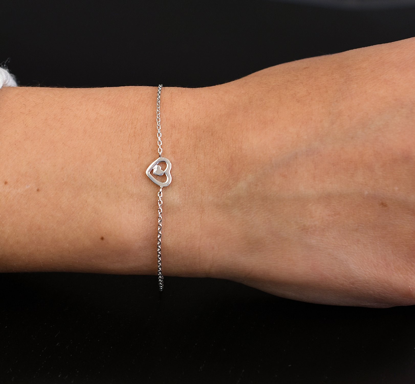 Le coeur est une forme universelle, utilisé pour représenter le symbole de la vie ou la représentation de l’amour dans toute sa splendeur. Ce bracelet 2 coeurs argent 925 rhodié unit un coeur ajouré et un coeur plein créant une harmonie des contrastes romantique.