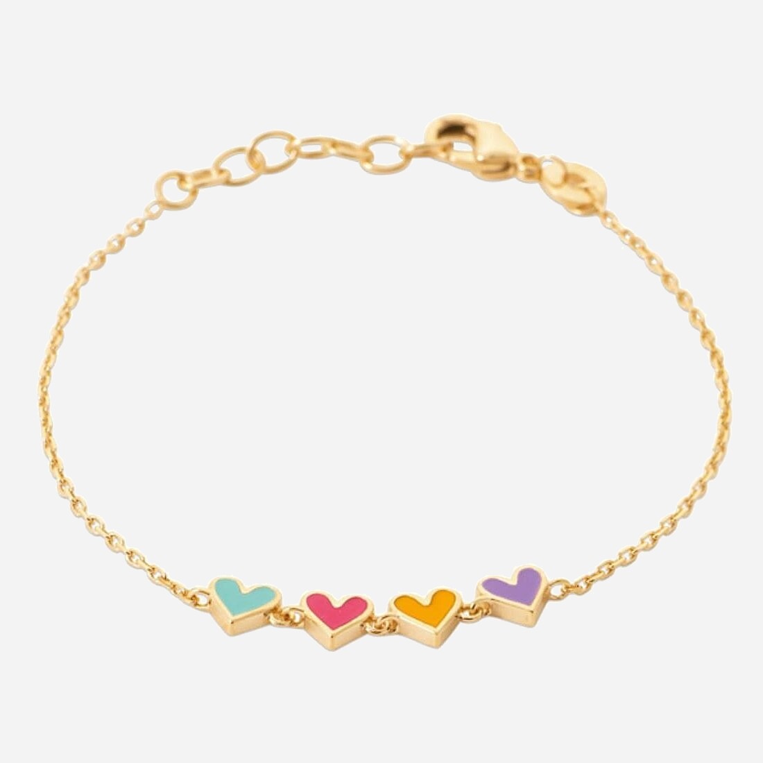 Le bracelet coeurs enfant plaqué or 750 avec sa suite de 4 cœurs en émail coloré allie douceur et élégance avec harmonie. Ce bracelet 4 coeurs est un bijou délicat qui apporte tendresse et fantaisie lumineuse au poignet de votre enfant.