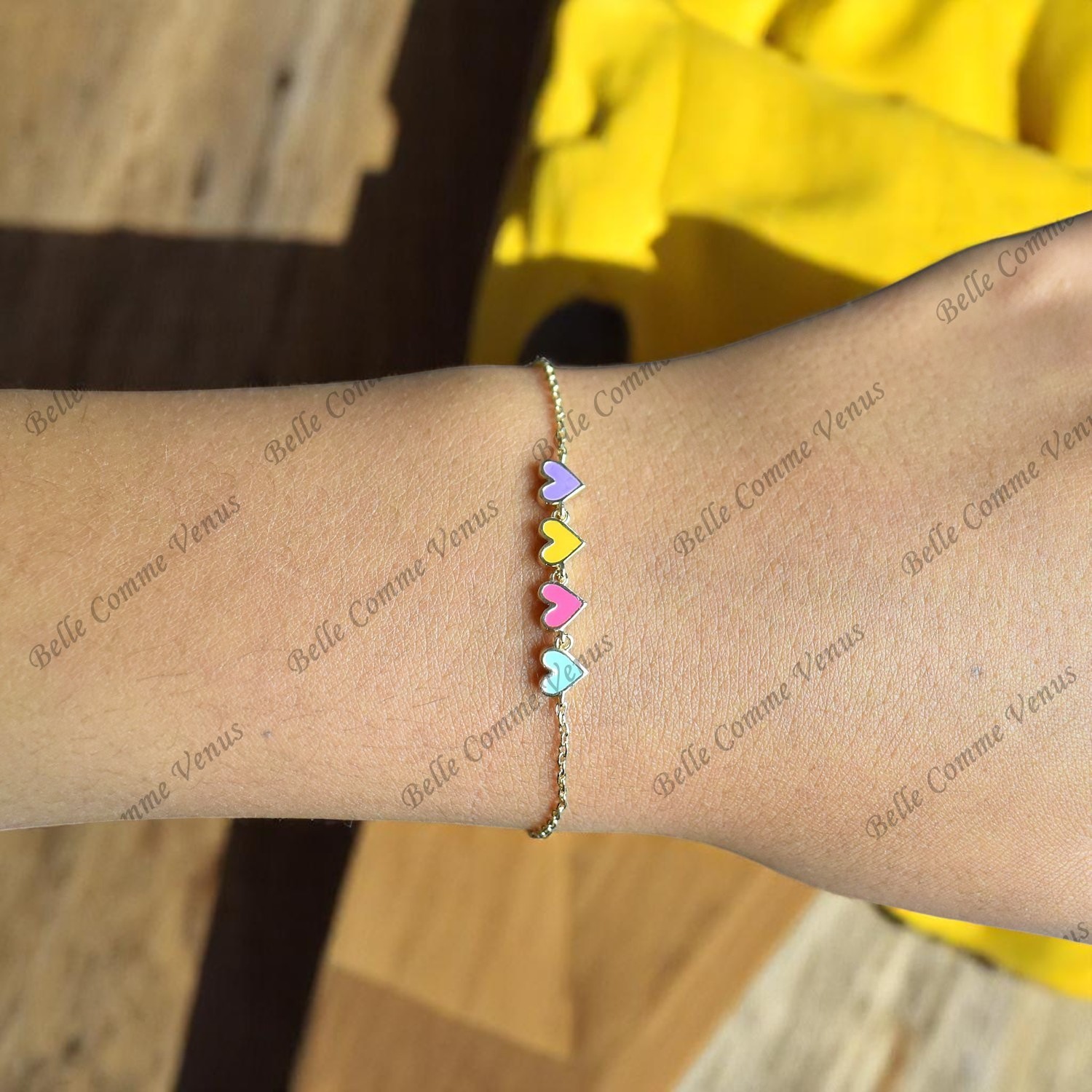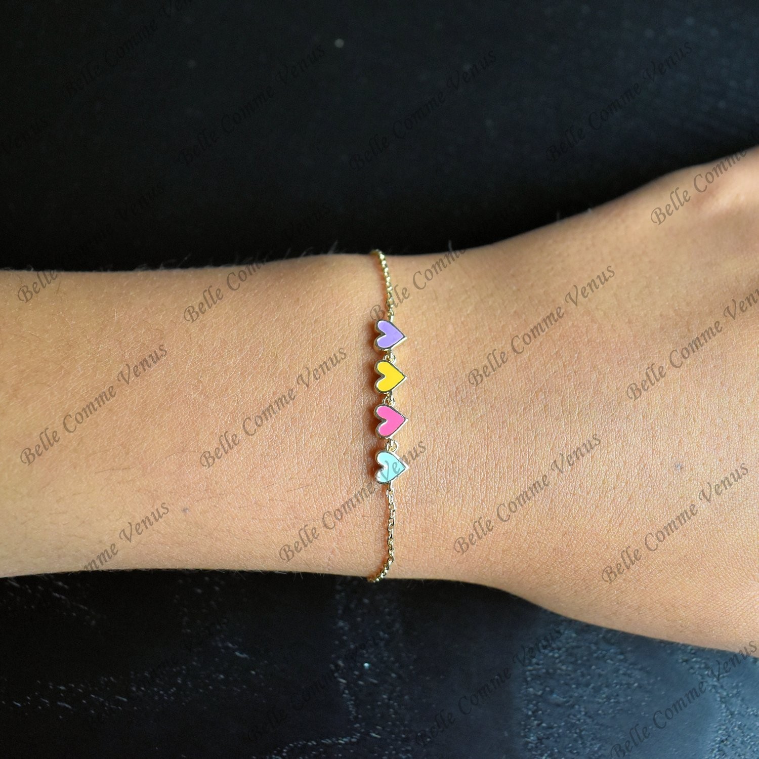 Le bracelet enfant suite de 4 coeurs émail coloré Plaqué or 750 3 microns est un bijou délicat qui allie douceur et élégance avec harmonie.