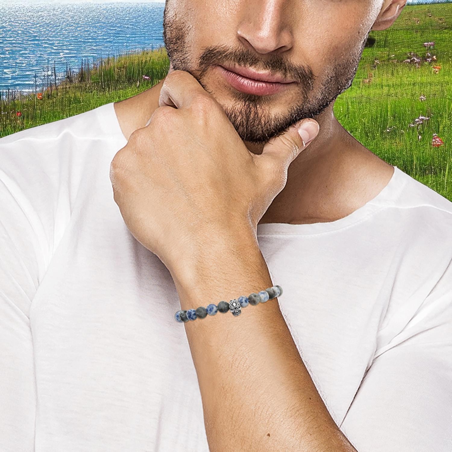 La sodalite, pierre aux reflets bleus profonds, s’associe au symbole tête de mort pour créer un bijou au caractère unique et assumé. L’acier assure une robustesse exceptionnelle et une résistance au quotidien. Un bracelet rock qui allie intensité minérale et sophistication métallique, parfait pour affirmer votre style avec audace et personnalité.