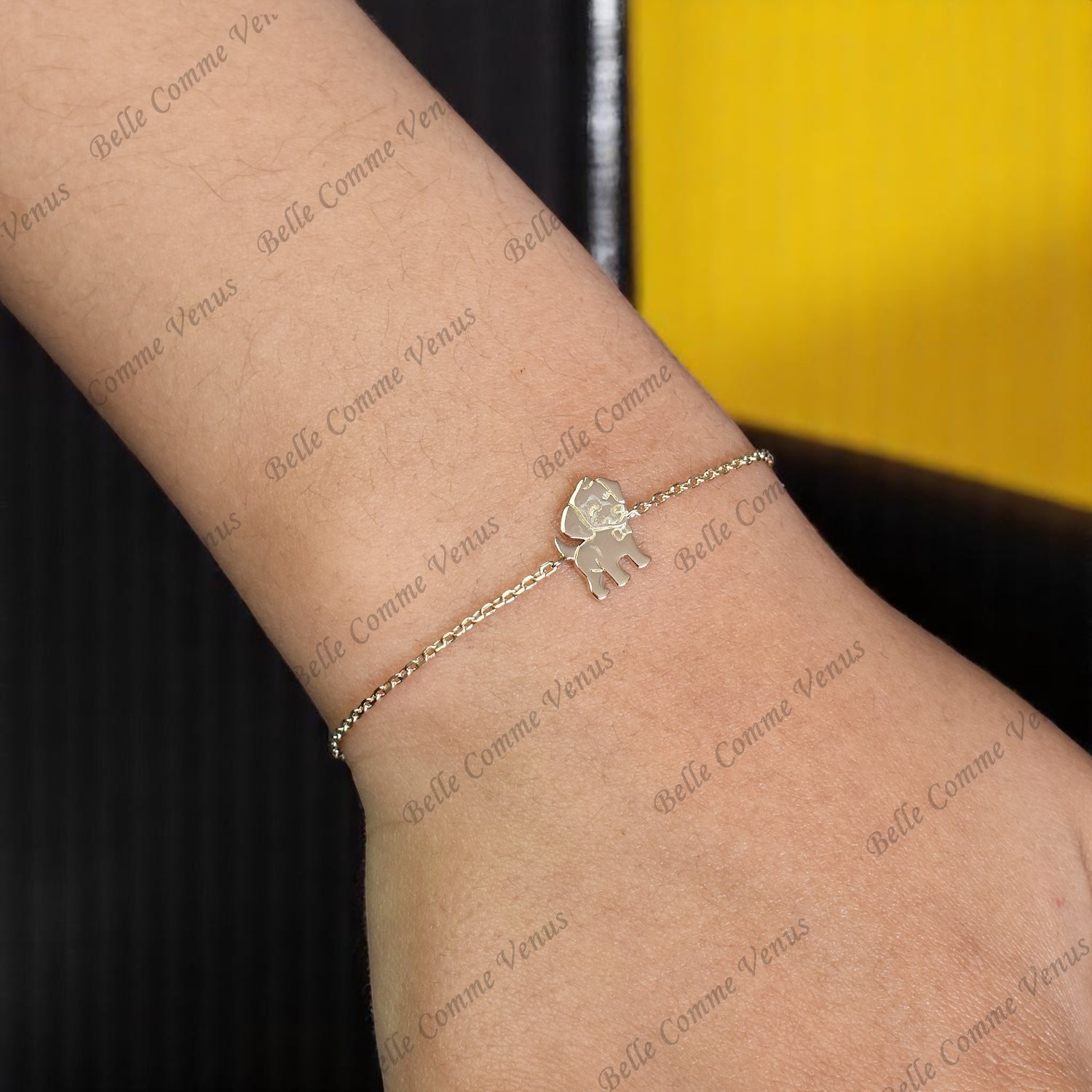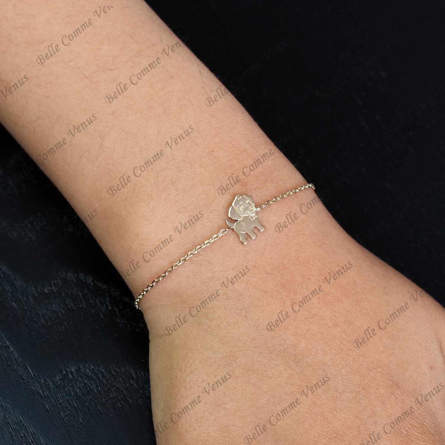 Un petit chien souriant en plaqué or 750 – 3 microns, spécialement conçu pour les poignets d’enfant. Ce bracelet miniature capture toute la joie de son compagnon préféré dans un format précieux.