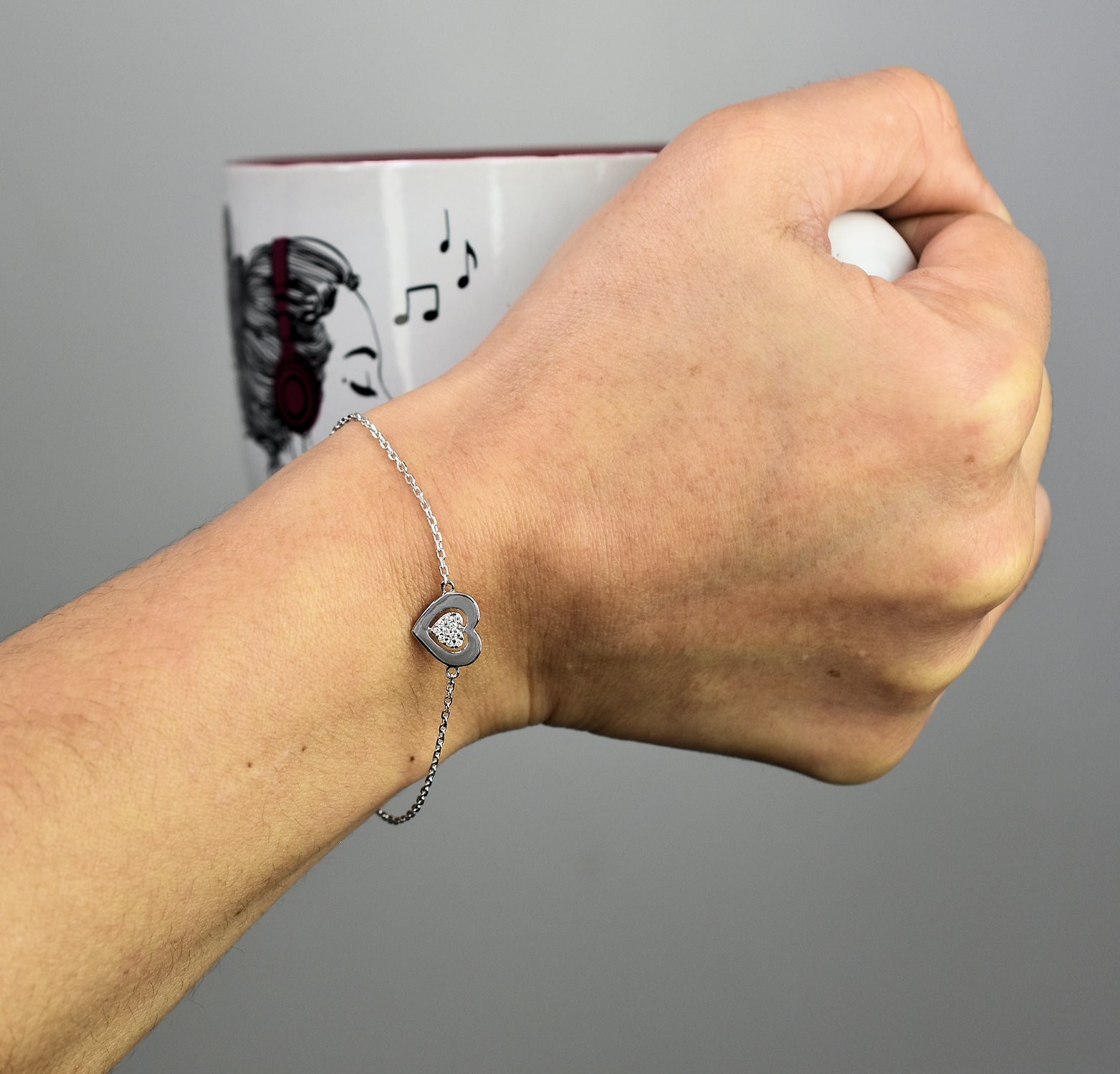 Ce bracelet cœur ajouré d’un autre cœur transforme le poignet en symbole d’amour fusionnel. Le design ajouré dévoile un second cœur serti d’oxydes de zirconium scintillants au centre. Cette création en argent 925 rhodié capture l’essence de deux âmes entrelacées dans un bijou qui célèbre l’union parfaite avec élégance raffinée et profondeur romantique remarquable.
