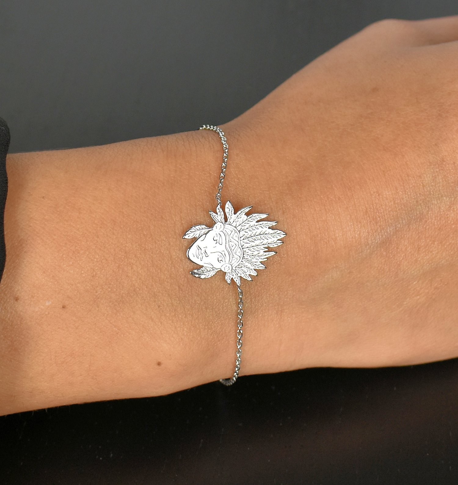 Le bracelet indien argent 925 plume célèbre l’héritage et la sagesse des peuples amérindiens. Cette tête d’indien finement ciselée avec sa coiffe plume en argent 925 rhodié capture la noblesse et la spiritualité dans un design ethnique raffiné.