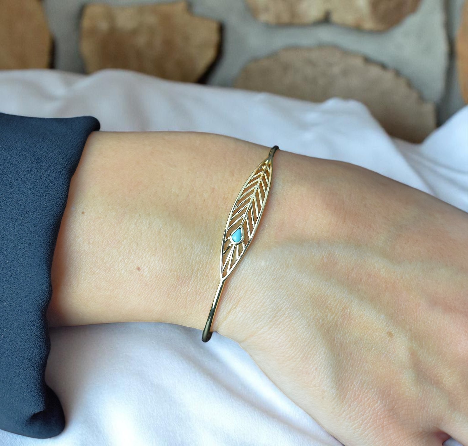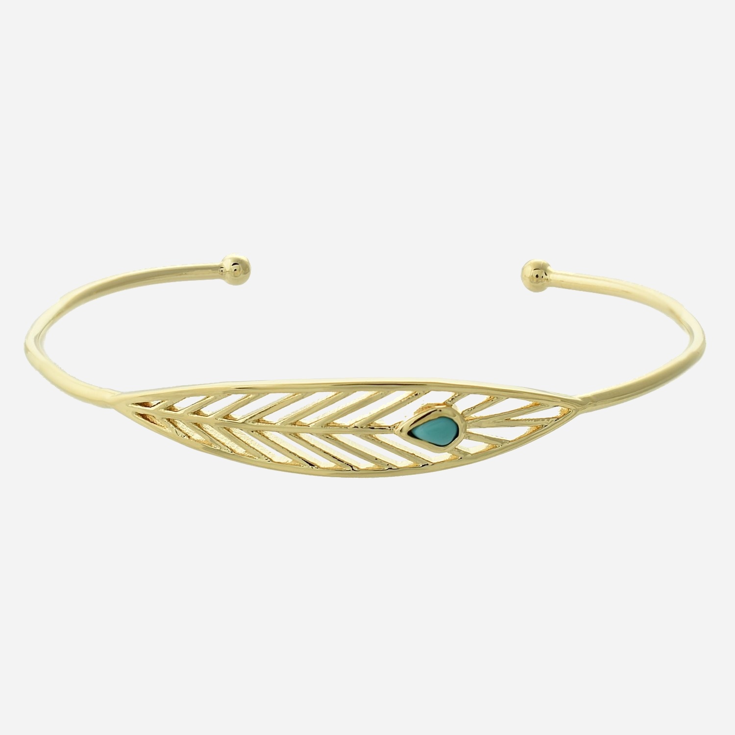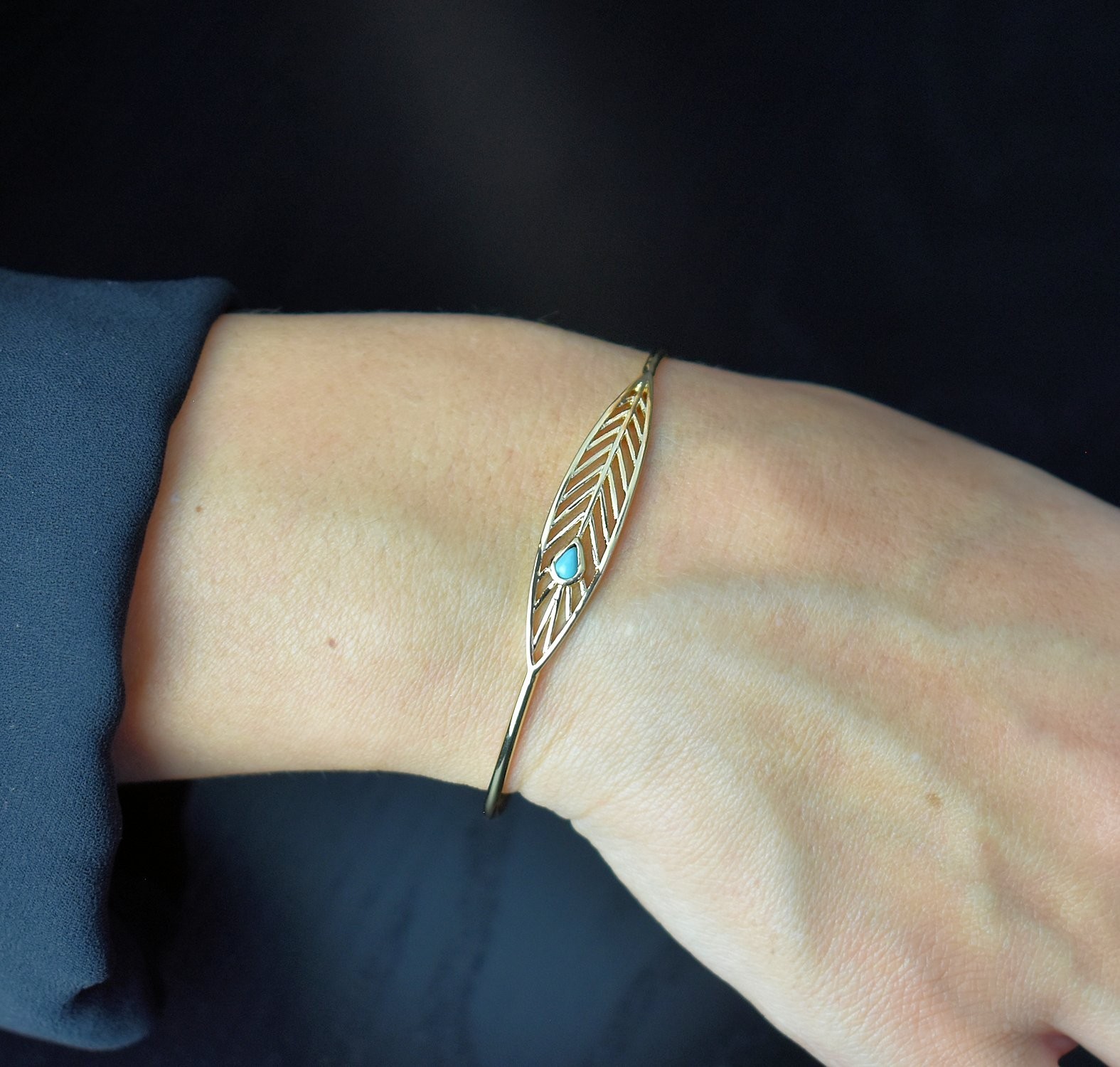 Bracelet jonc plume plaqué or perle turquoise : liberté et légèreté