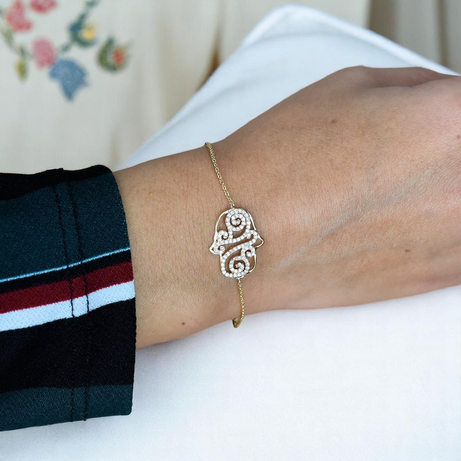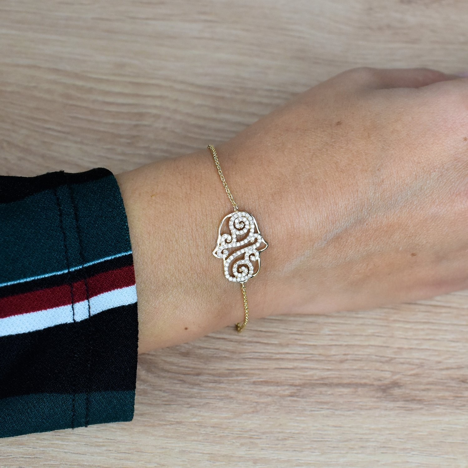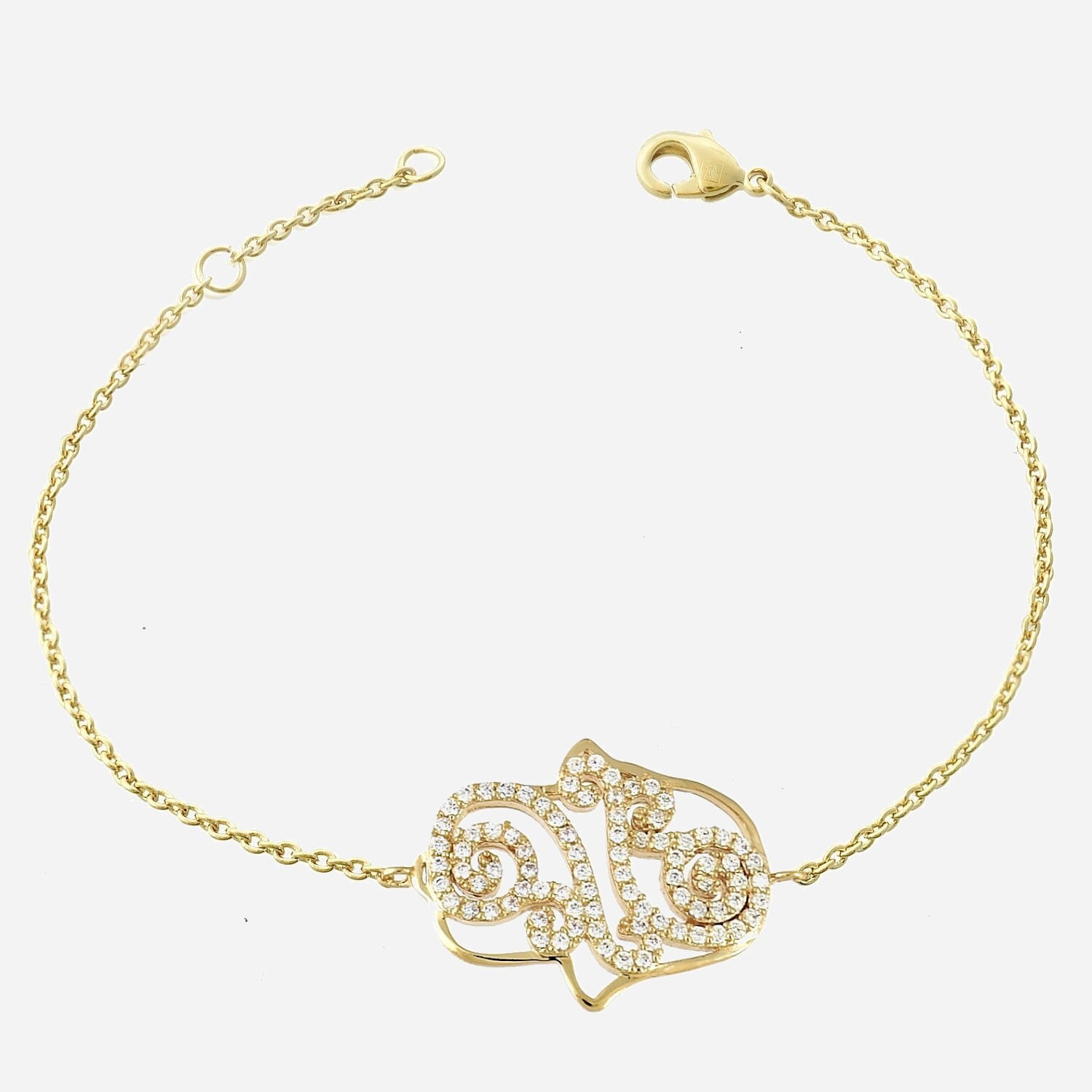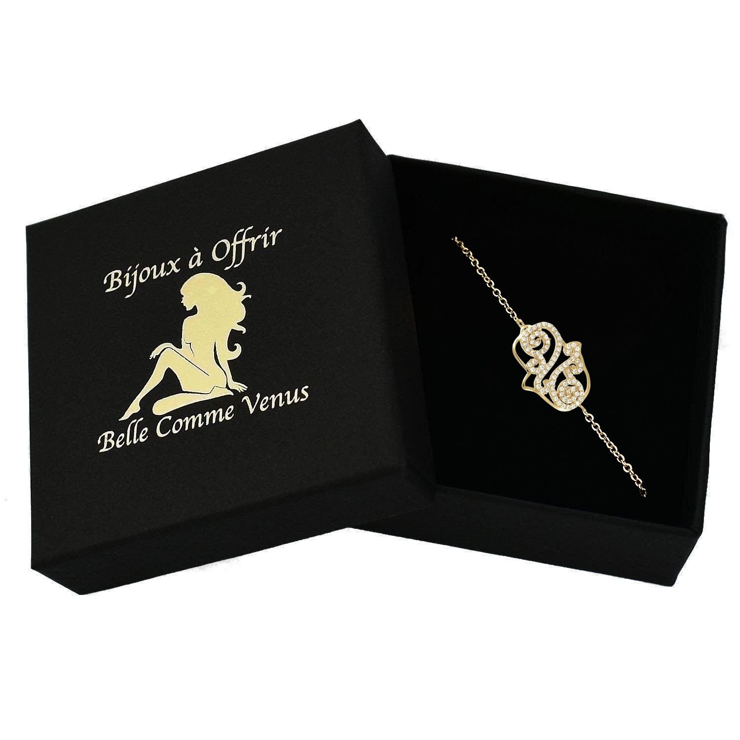 Découvrez notre magnifique bracelet Main de Fatma arabesque plaqué OR 750 avec oxydes de zirconiums.