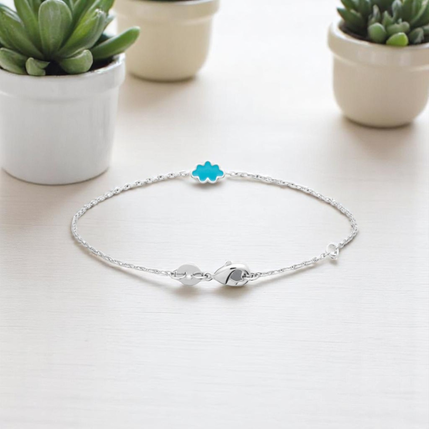 Ce bracelet enfant nuage conjugue imaginaire enfantin et qualité durable. L’émail bleu apporte couleur et fantaisie tandis que l’argent 925 rhodié garantit éclat résistant et protection contre l’oxydation. Un bijou tendre qui accompagne les rêves et l’imagination de votre enfant avec légèreté.