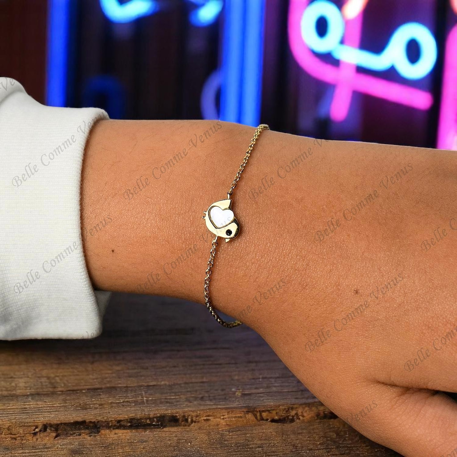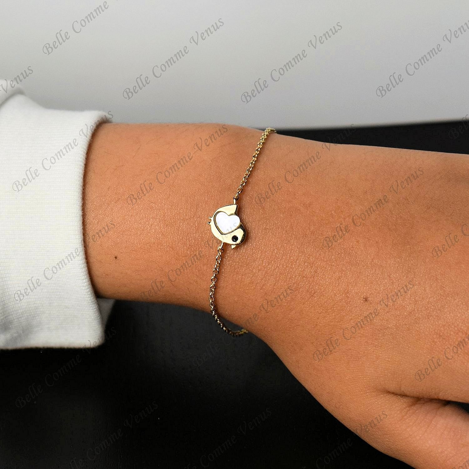 Le bracelet oiseau plaqué or 750 3 microns avec coeur de nacre et œil oxyde de zirconium noir est un bijou original et tendre pour les enfants. L’oiseau, symbole de liberté, légèreté et joie, combine ici éléments naturels et raffinés dans un design enchanteur.