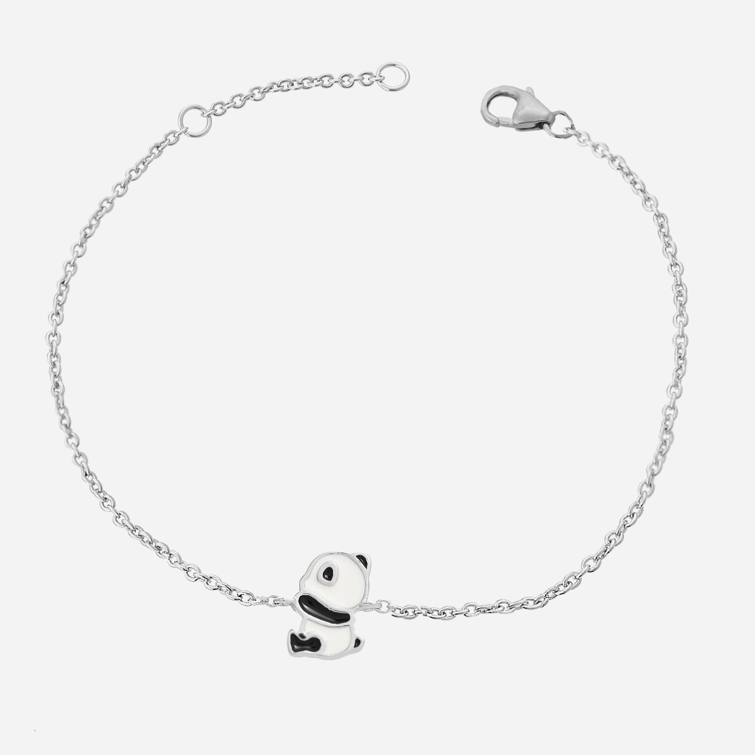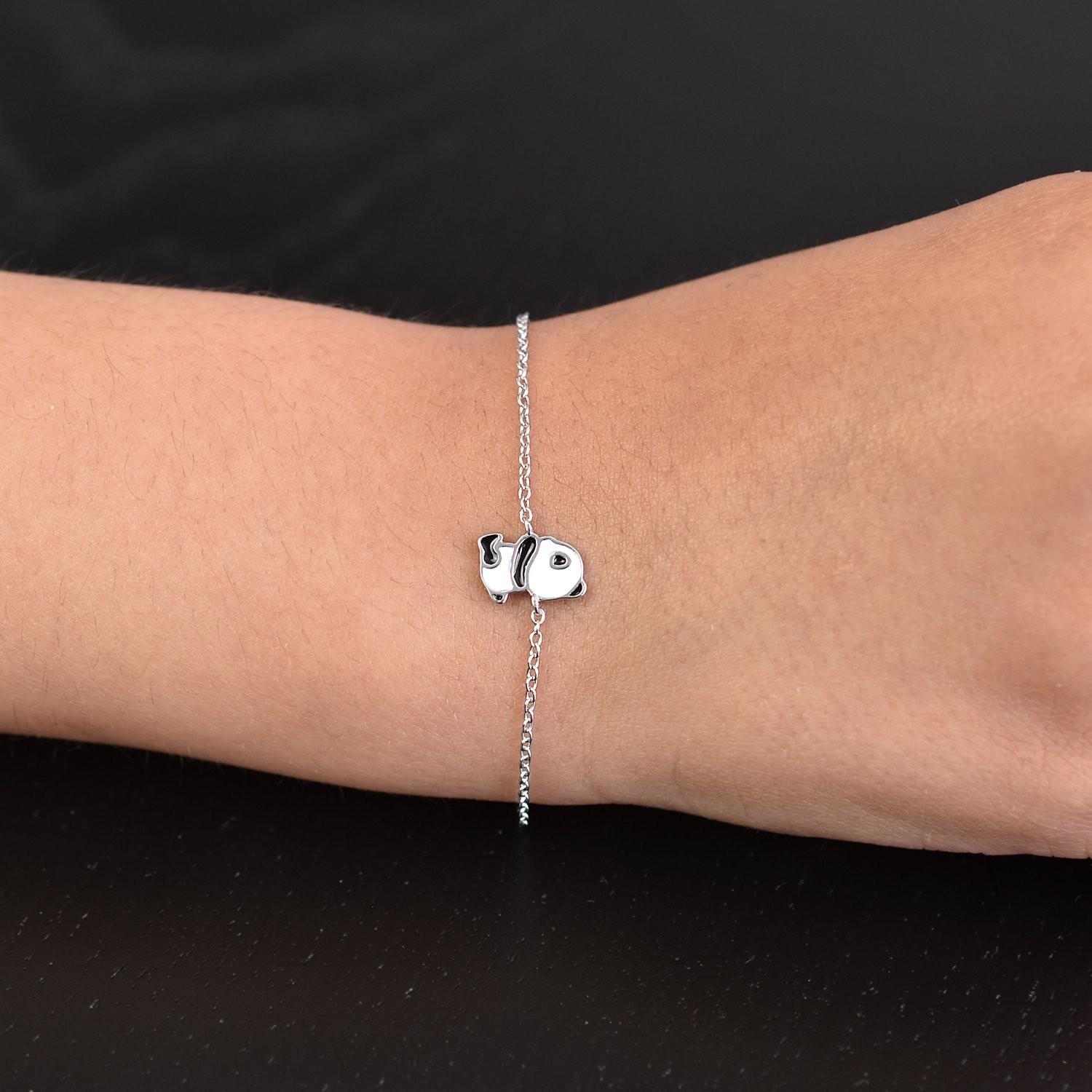 Adorable bracelet panda en argent 925 rhodié avec émail noir et blanc. Design élégant et mignon, parfait pour les amoureux des animaux. Idéal comme cadeau d'anniversaire, baptême ou communion.