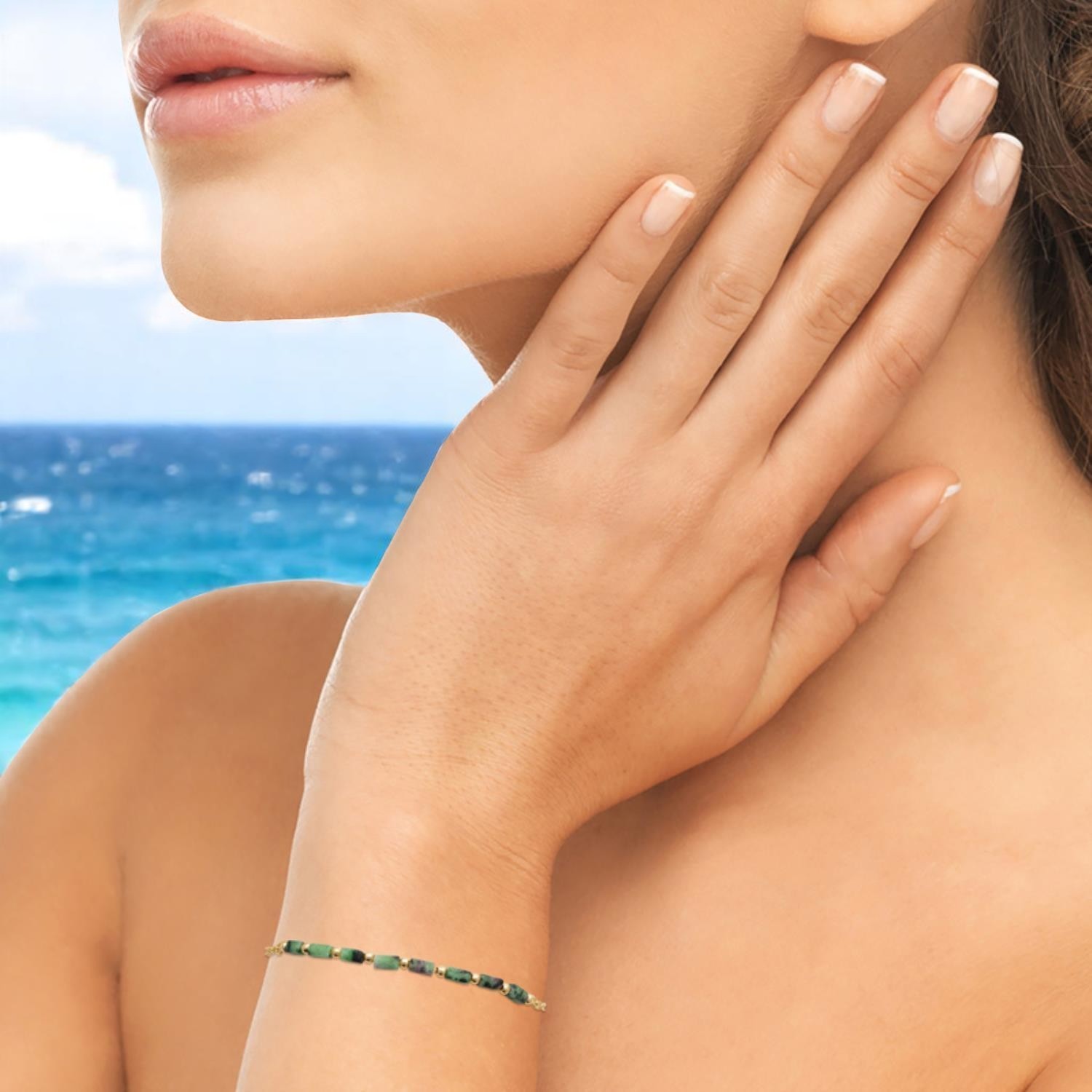 Ce bracelet plaqué or rubis zoïsite marie la puissance visuelle du rubis et de la zoïsite naturelle. Les pierres révèlent un contraste captivant entre le rouge intense du rubis et le vert profond de la zoïsite, sublimé par l’éclat précieux du plaqué or 750 3 microns. Une monture dorée qui traverse le temps avec brillance et résistance.