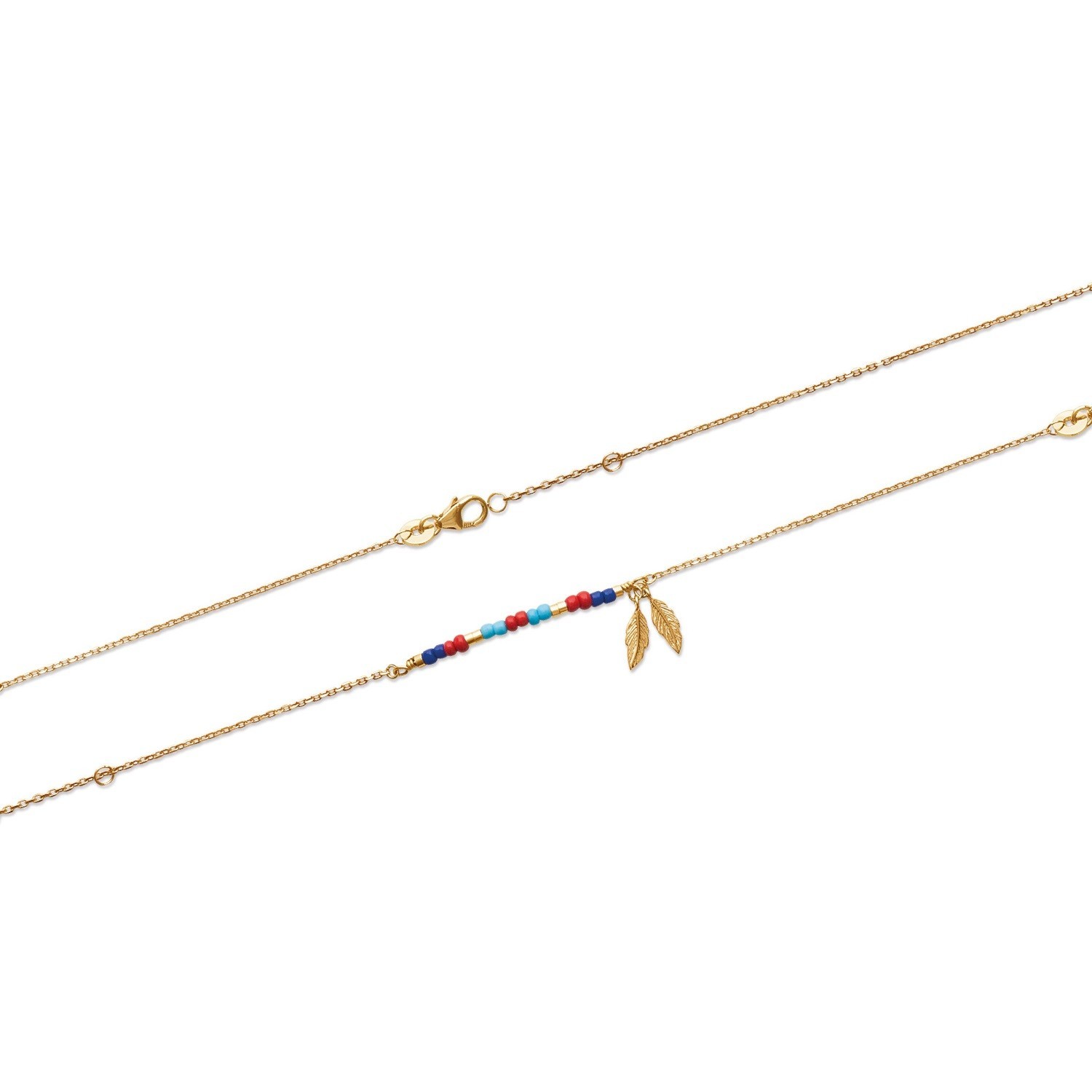 Des plumes délicates alternées avec des perles colorées qui dansent sur une chaîne plaqué or 750 – 3 microns. Chaque élément capture la lumière différemment : l’éclat doré du métal, la brillance des perles, la légèreté aérienne des plumes.