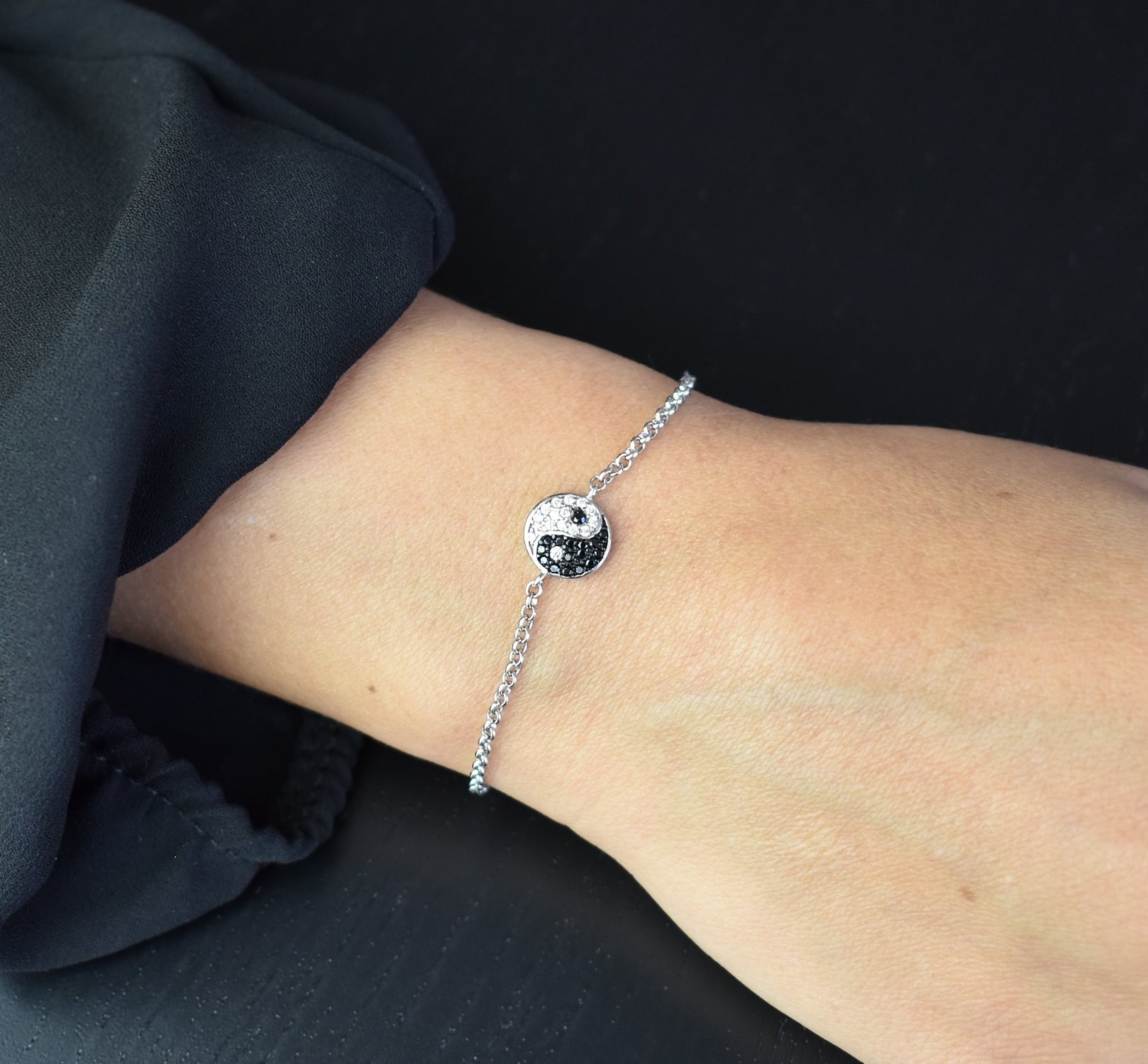 Le symbole yin yang rappelle l’importance de l’équilibre dans la vie, porté ici avec élégance et discrétion. Les oxydes de zirconium captent la lumière et renforcent le contraste blanc-noir du motif. Le rhodiage protège l’argent du ternissement pour un bracelet qui conserve son éclat sans entretien contraignant. Minimaliste et chargé de sens, il se porte seul pour un poignet épuré ou se superpose avec d’autres bracelets pour un style plus bohème.