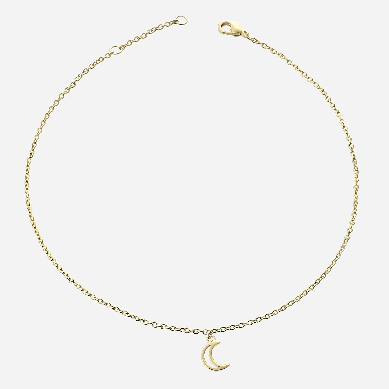 La chaîne de cheville plaqué or 750 3 microns avec croissant de lune ajouré sublime vos chevilles avec poésie céleste et mystère nocturne. Le croissant de lune symbolise le rêve, le mystère de la nuit, la féminité et les cycles naturels dans sa forme la plus délicate.