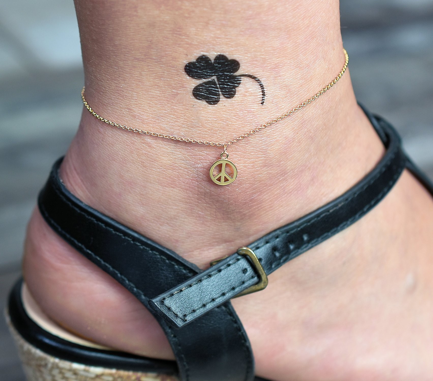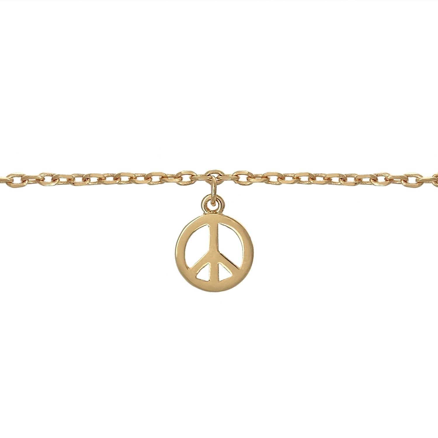 Cette chaîne de cheville Peace and Love porte le message universel de paix et d’amour. Le symbole iconique délicatement ciselé en plaqué or 750 3 microns évoque l’esprit hippie intemporel et les valeurs de tolérance. Ce pendant doré transforme un message philosophique en bijou de cheville qui sublime la silhouette avec optimisme lumineux et élégance positive remarquable.