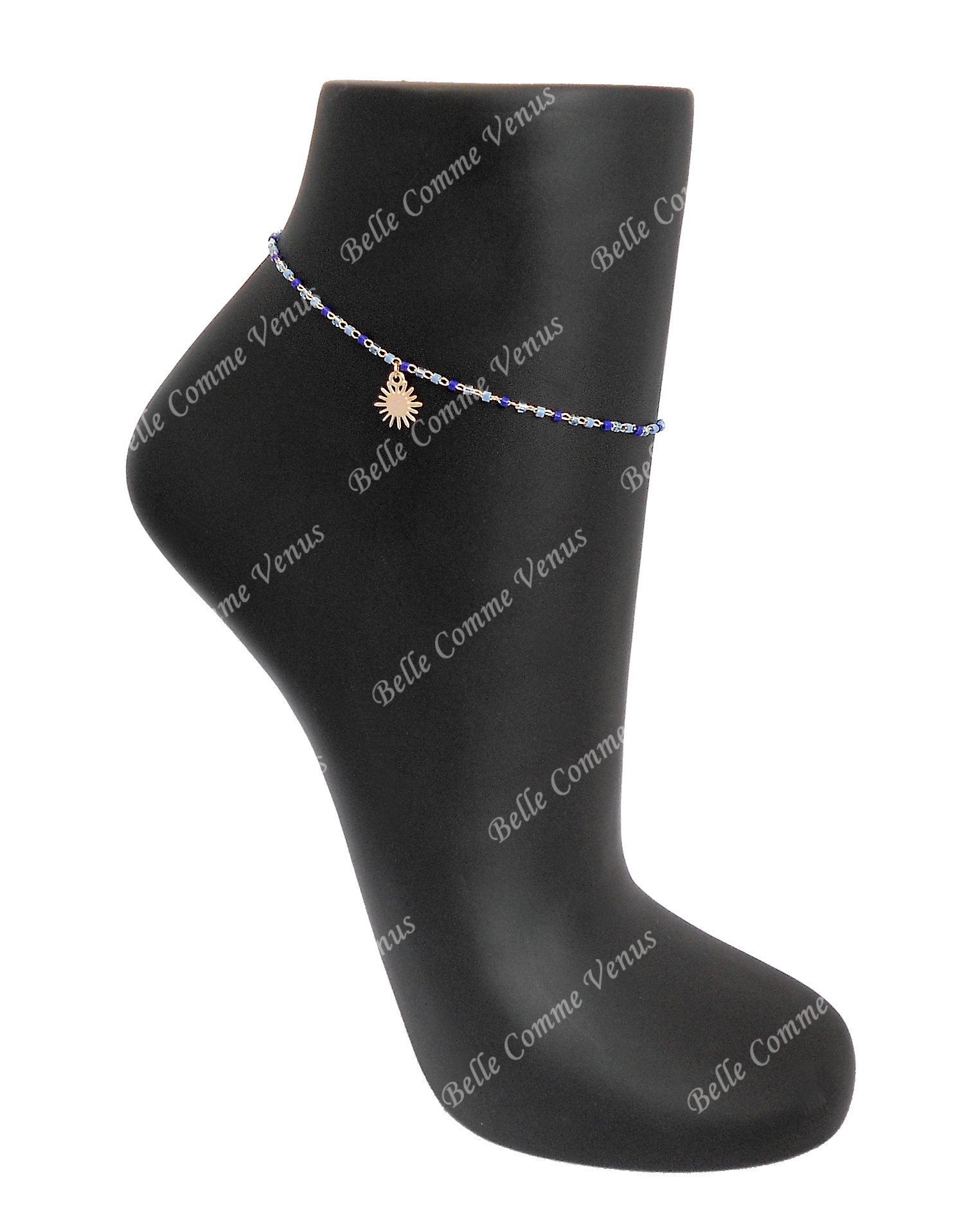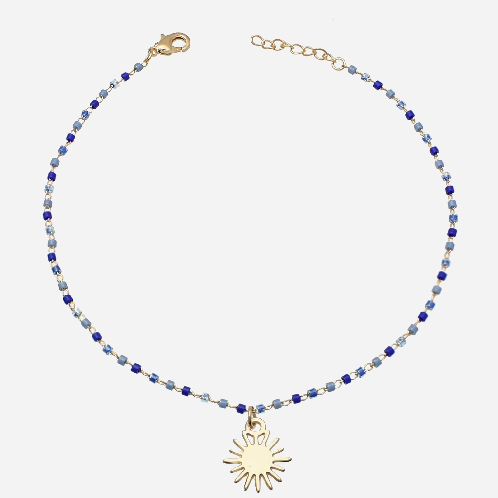 Le soleil délicat accompagné de perles Miyuki aux nuances bleues dégradées évoque l’océan, le ciel et la sérénité estivale. Le plaqué or 3 microns garantit un éclat doré durable à ce bijou de cheville qui sublime vos pieds avec poésie marine.