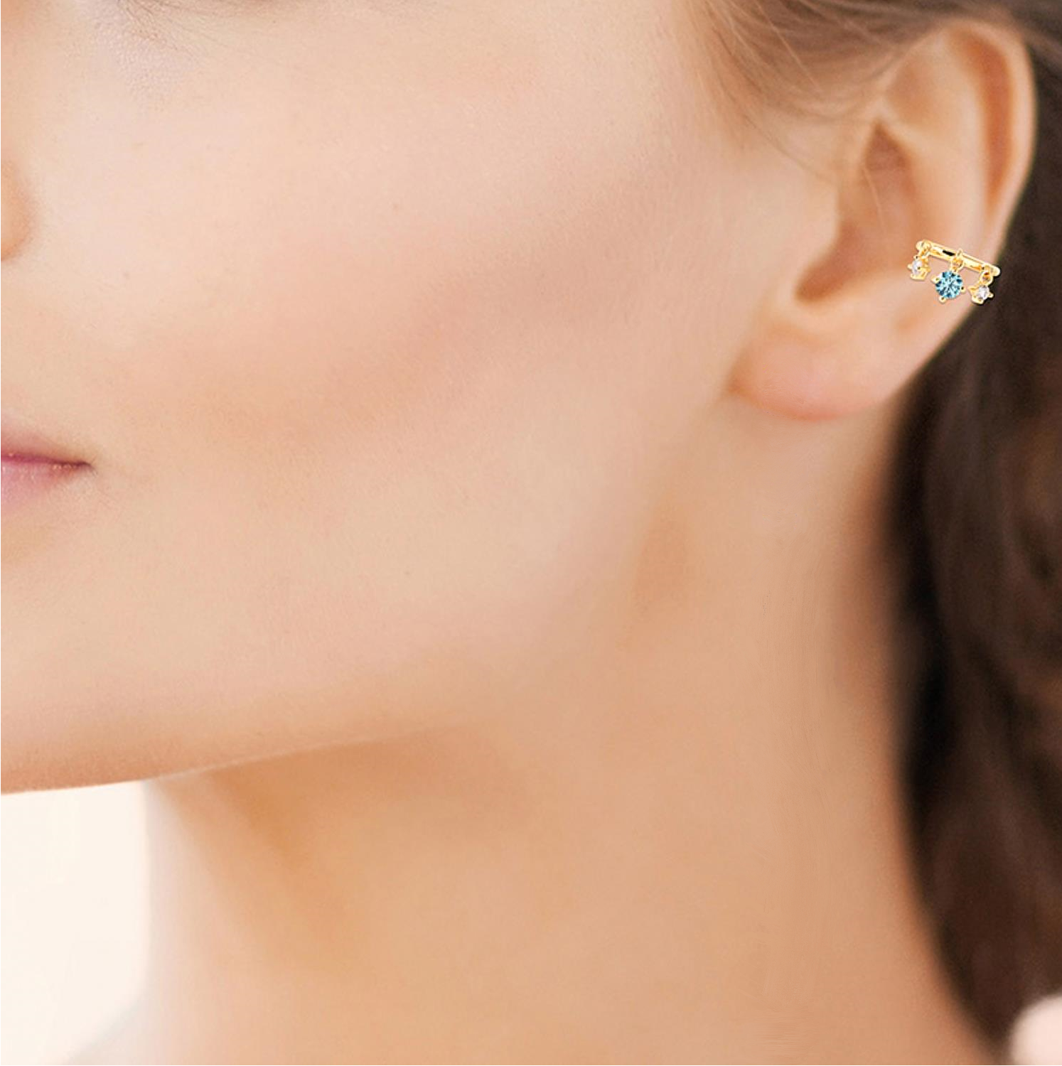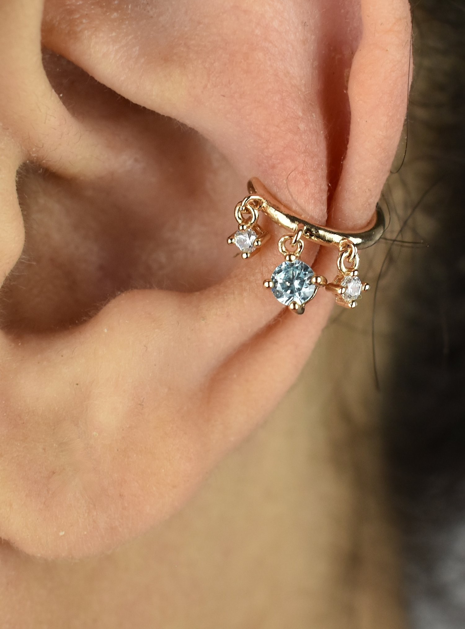 Le clip oreille earcuff plaqué or zirconium incarne la modernité et la brillance dorée. Ce earcuff avec 3 oxydes de zirconium pendants dont un central bleu en plaqué or 750 3 microns capture l’essence du style contemporain dans un design doré scintillant sans perçage.