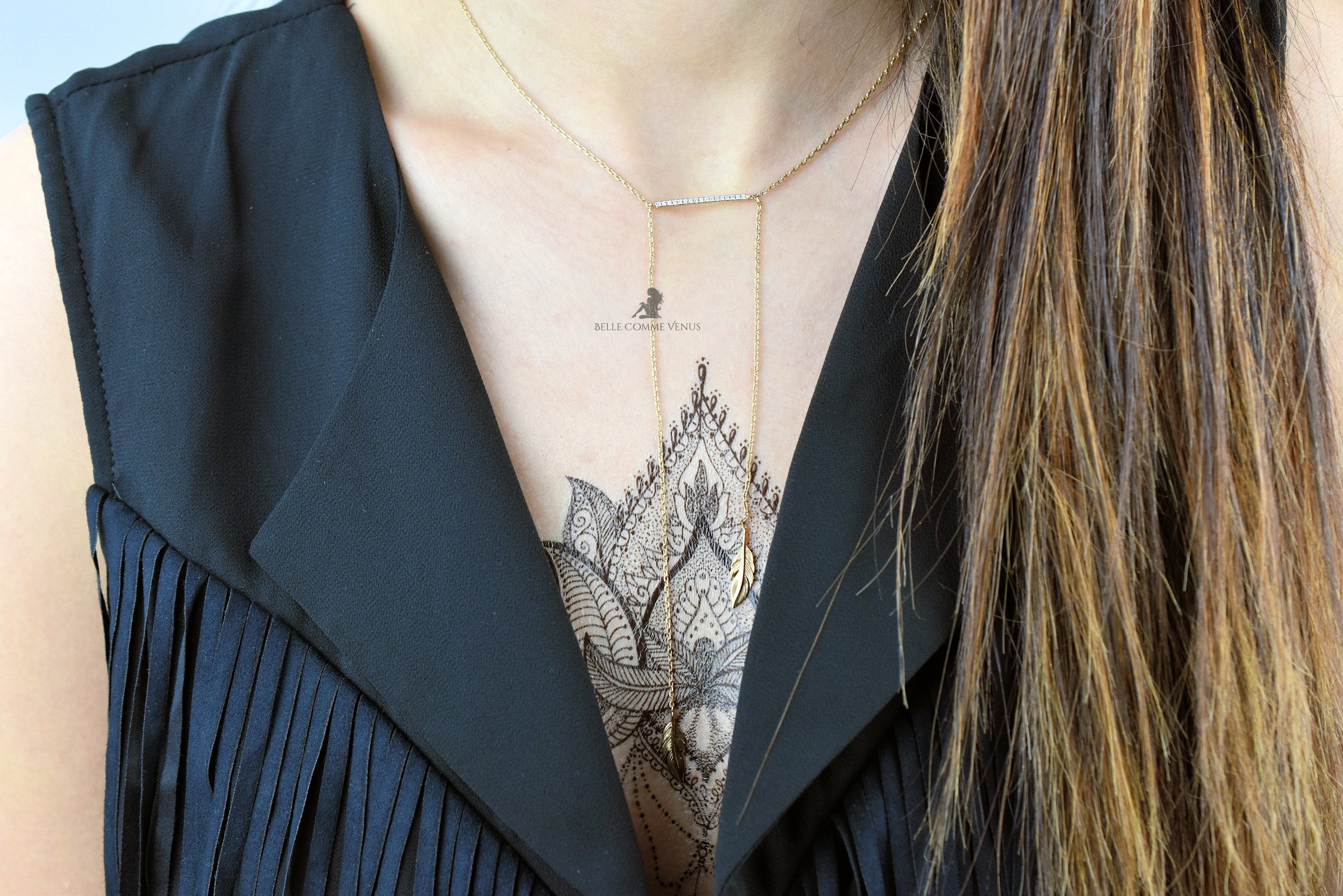 Collier deux plumes pendantes barre plaqué or : légèreté bicolore spirituelle