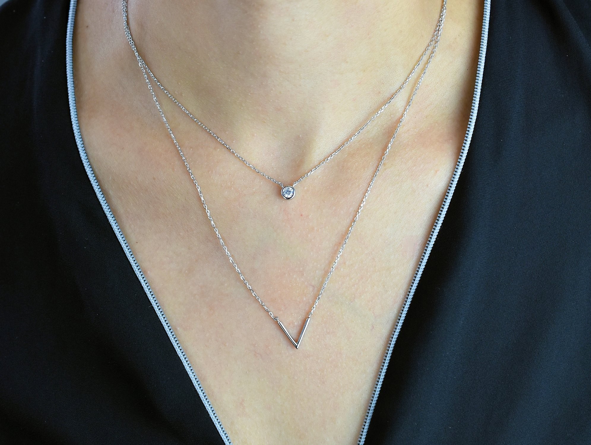 Le collier 2 rangs argent 925 rhodié avec forme V et oxyde de zirconium rond crée un design moderne et sophistiqué qui sublime le décolleté. La superposition des 2 rangs apporte profondeur et mouvement avec élégance géométrique contemporaine.