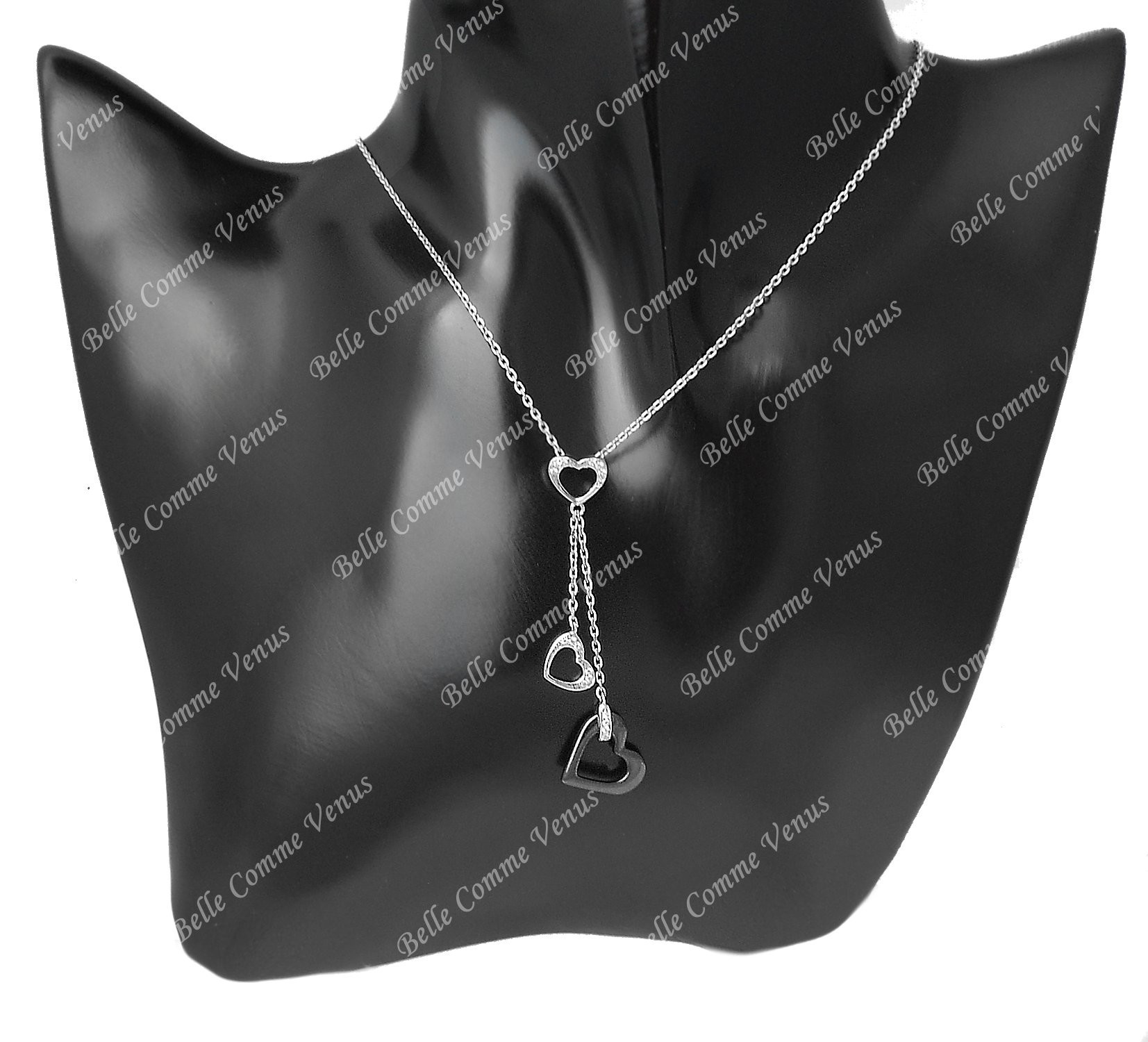 Collier 3 coeurs argent 925 oxyde zirconium céramique noire : triple amour moderne
