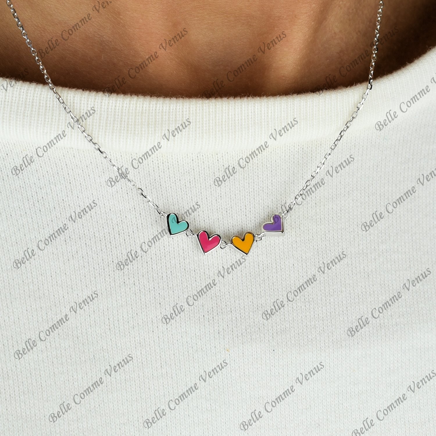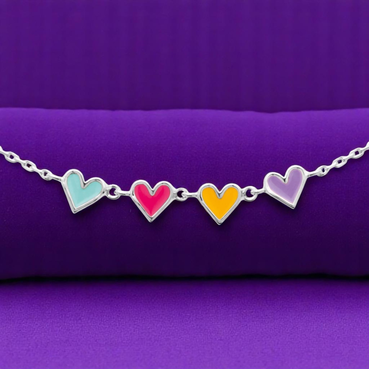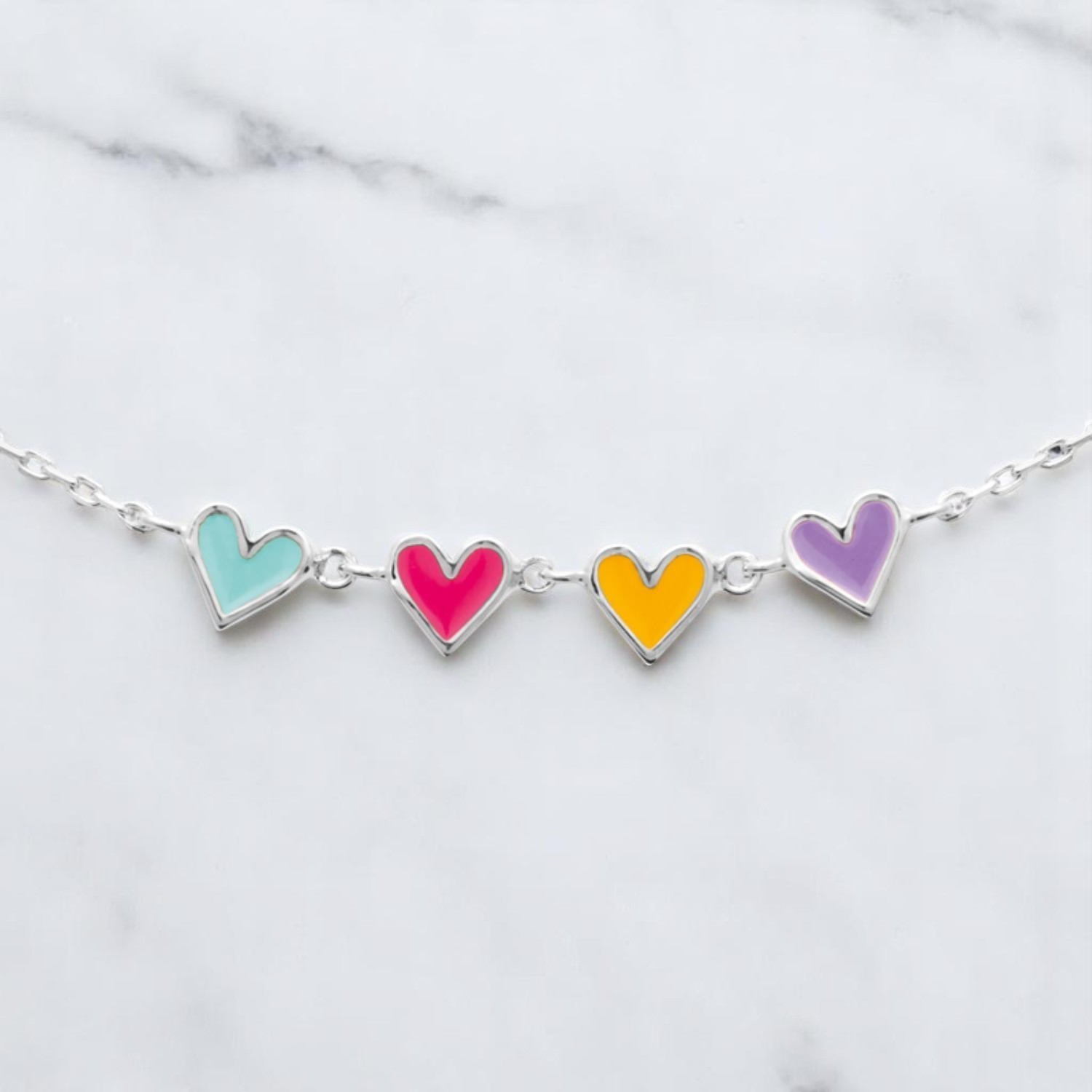 Le collier enfant suite de 4 coeurs émail coloré Argent 925 Rhodié est un bijou délicat qui allie douceur et élégance avec harmonie.