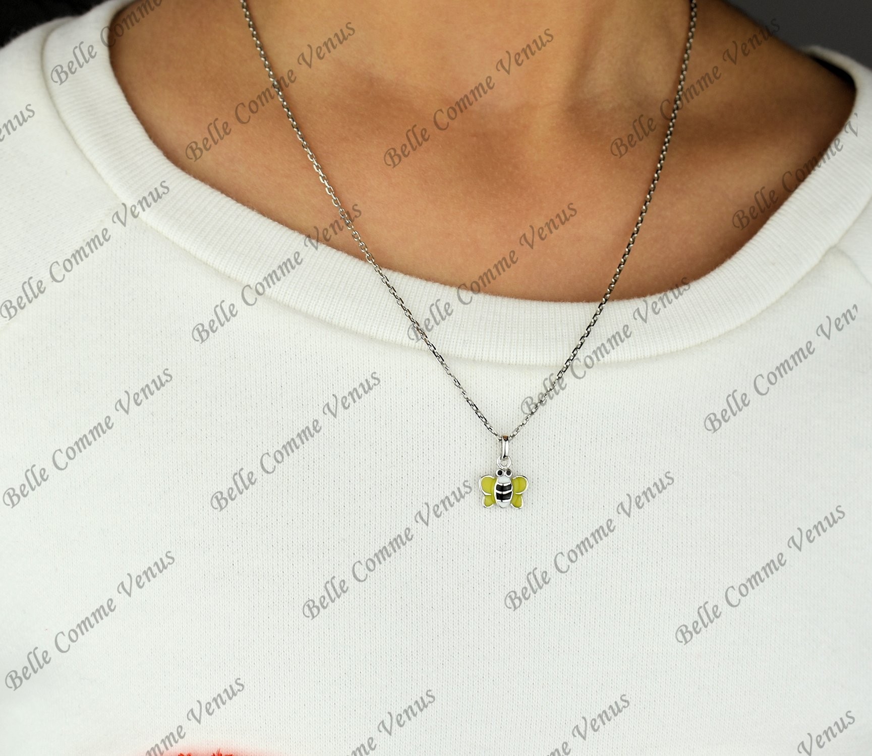 Le pendentif représentant une petite abeille en émail jaune, noir et blanc mesure 0.9 cm de hauteur et 0.7 cm de largeur, ajoutant une touche de charme à ce collier.