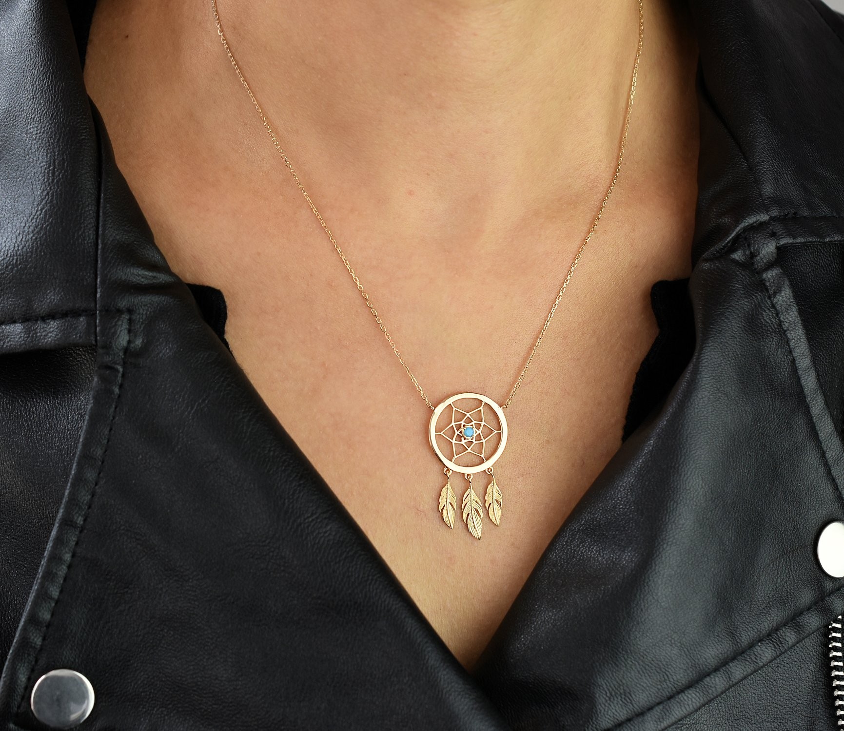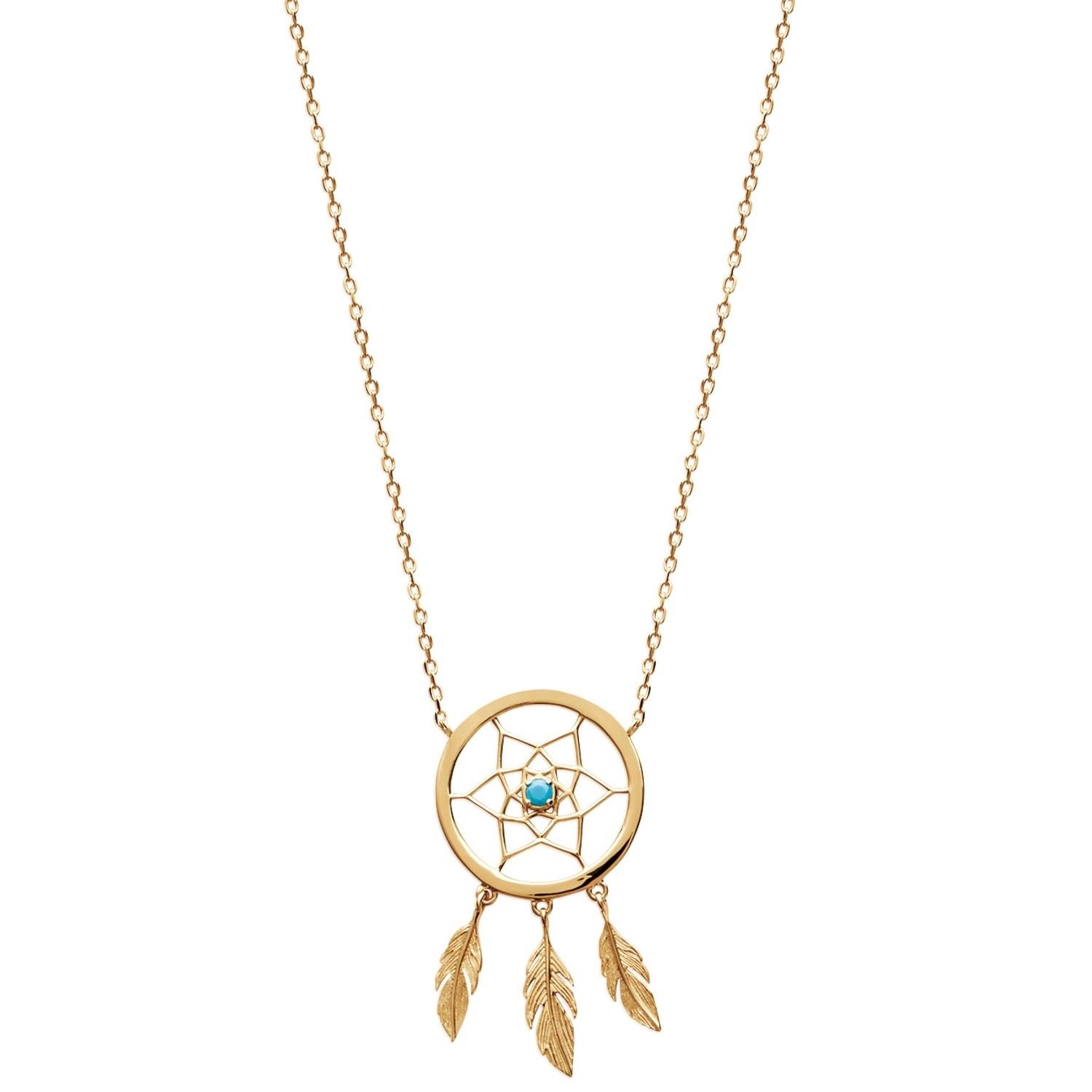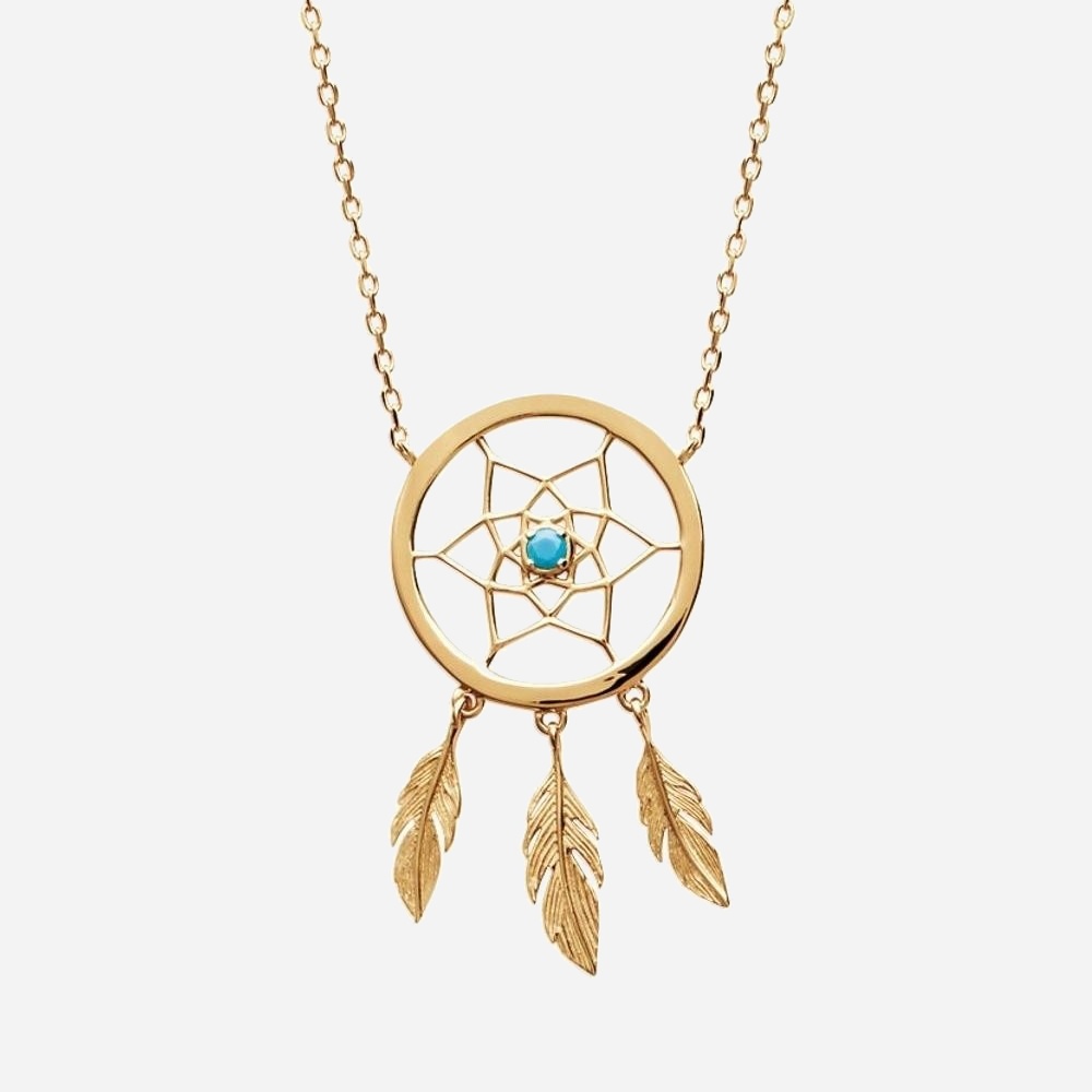 La perle turquoise ajoute une touche de couleur apaisante et spirituelle protectrice à ce talisman mystique. Le plaqué or 750 3 microns garantit éclat durable et raffinement doré. Un collier attrape-rêve qui célèbre la protection, les rêves paisibles et la spiritualité avec élégance dorée et authenticité culturelle amérindienne intemporelle.