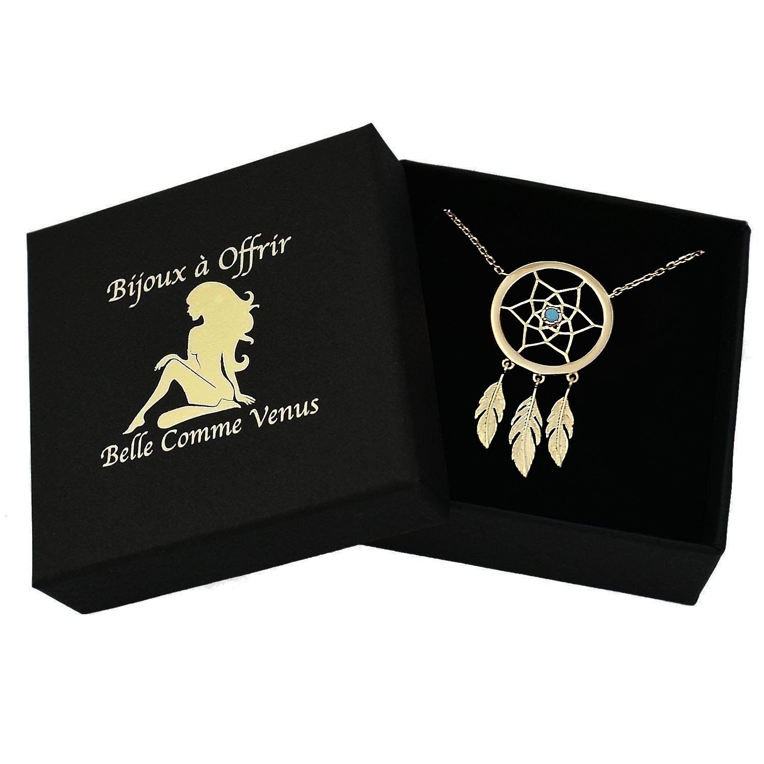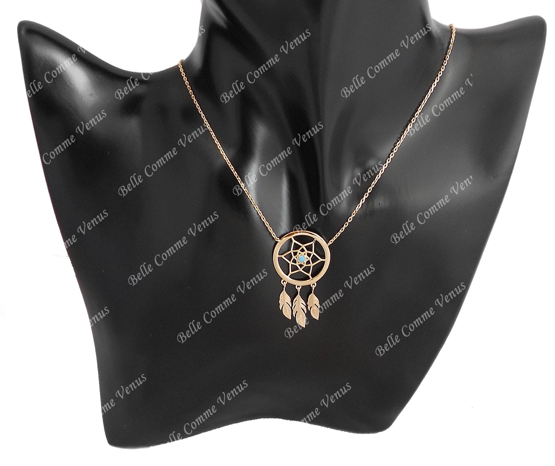 Le collier attrape rêve plaqué or 750 3 microns avec perle bleu turquoise est une amulette de protection, totem de bonne fortune et porte-bonheur ancestral. Le capteur de rêve empêche les mauvais rêves d’envahir le sommeil de son détenteur, filtrant les énergies négatives pour ne laisser passer que les songes bienveillants.