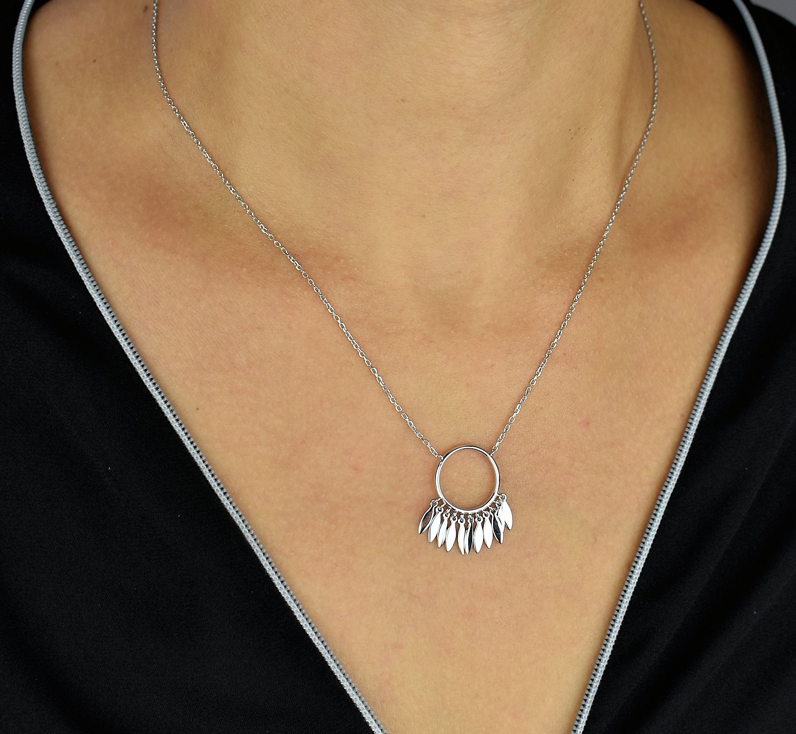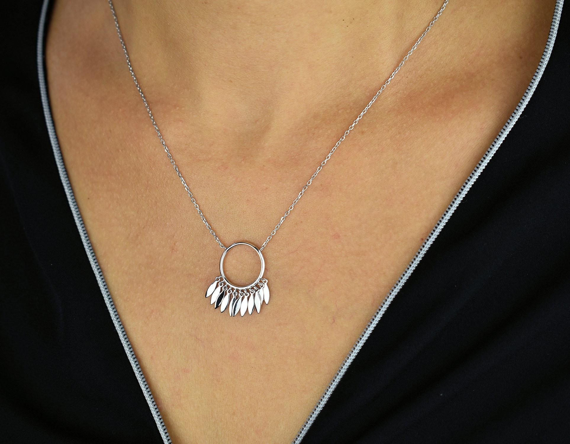 Les petites plumes pendantes dansent avec grâce, tandis que le cercle en argent 925 structure l’ensemble avec élégance. La finition rhodiée garantit une brillance durable. Un collier qui affirme un style bohème raffiné et une personnalité éprise de liberté.