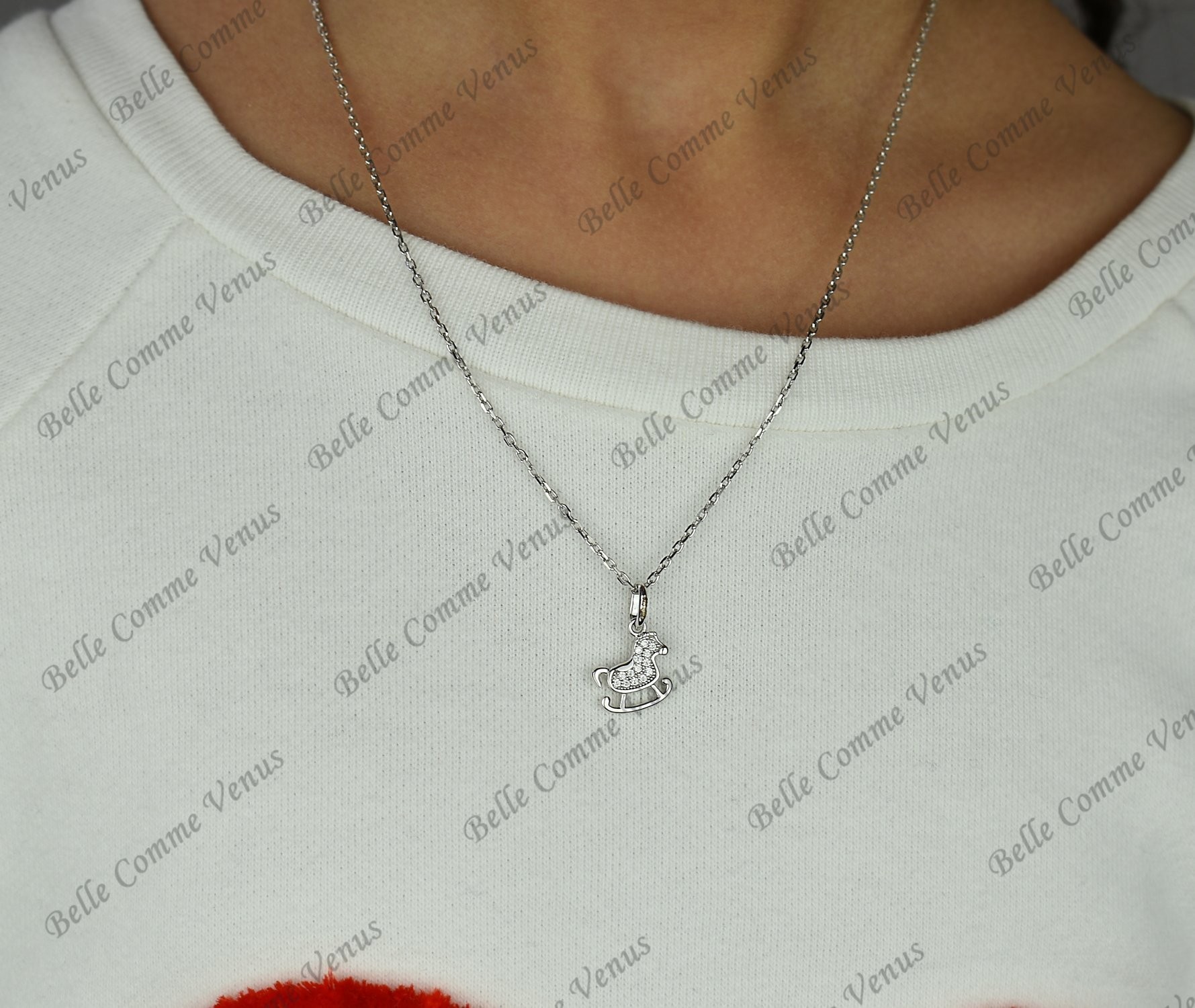 La longueur de la chaîne de ce collier est de 40 cm, ce qui le rend idéal pour les jeunes enfants. Le pendentif en forme de cheval à bascule serti d'oxydes de zirconium mesure 1.6 cm de hauteur et 1.2 cm de largeur, offrant une taille parfaite pour un look délicat et élégant.