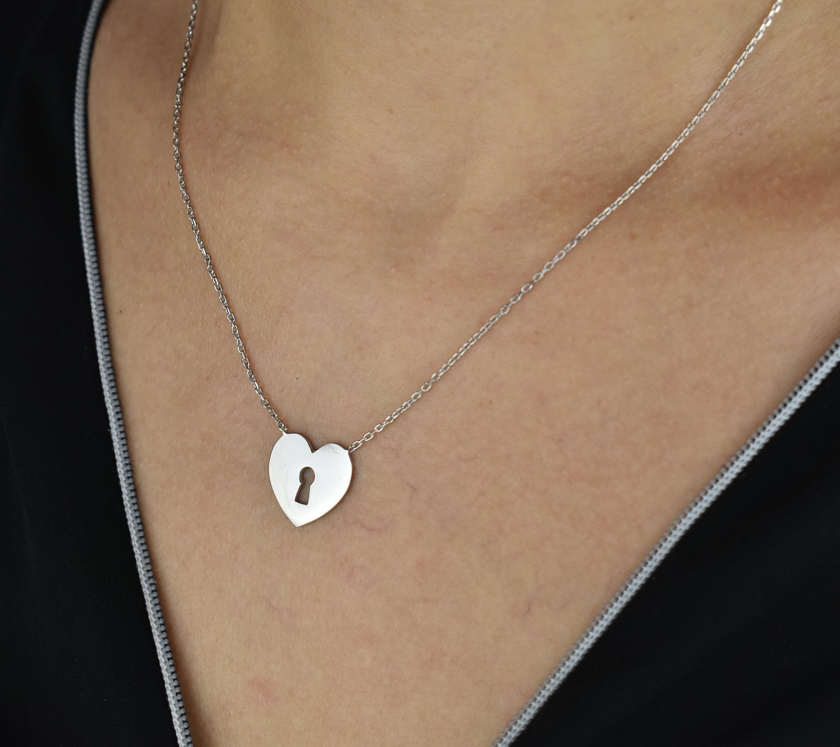 Ce collier ravissant arbore un pendentif cœur ajouré avec une clé, symbolisant l'amour et la romance, ajoutant une touche de beauté à votre décolleté.