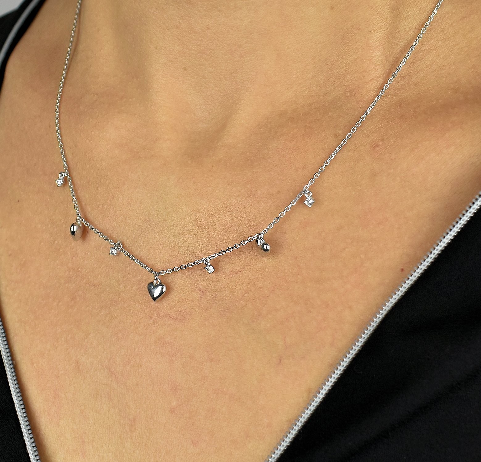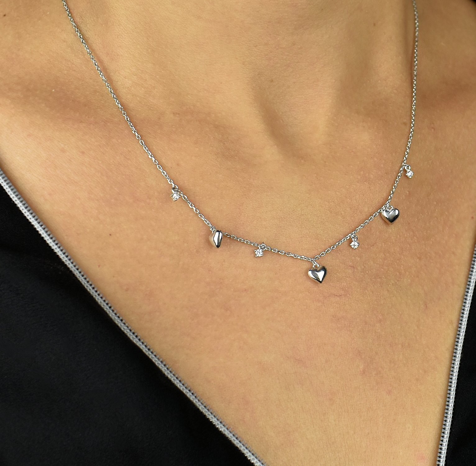 Le collier cœur argent 925 zirconium incarne l’essence même de l’amour et de la vie. Cette suite de cœurs en argent 925 rhodié alternés avec des oxydes de zirconium capture la symbolique universelle du cœur dans un design raffiné et lumineux.